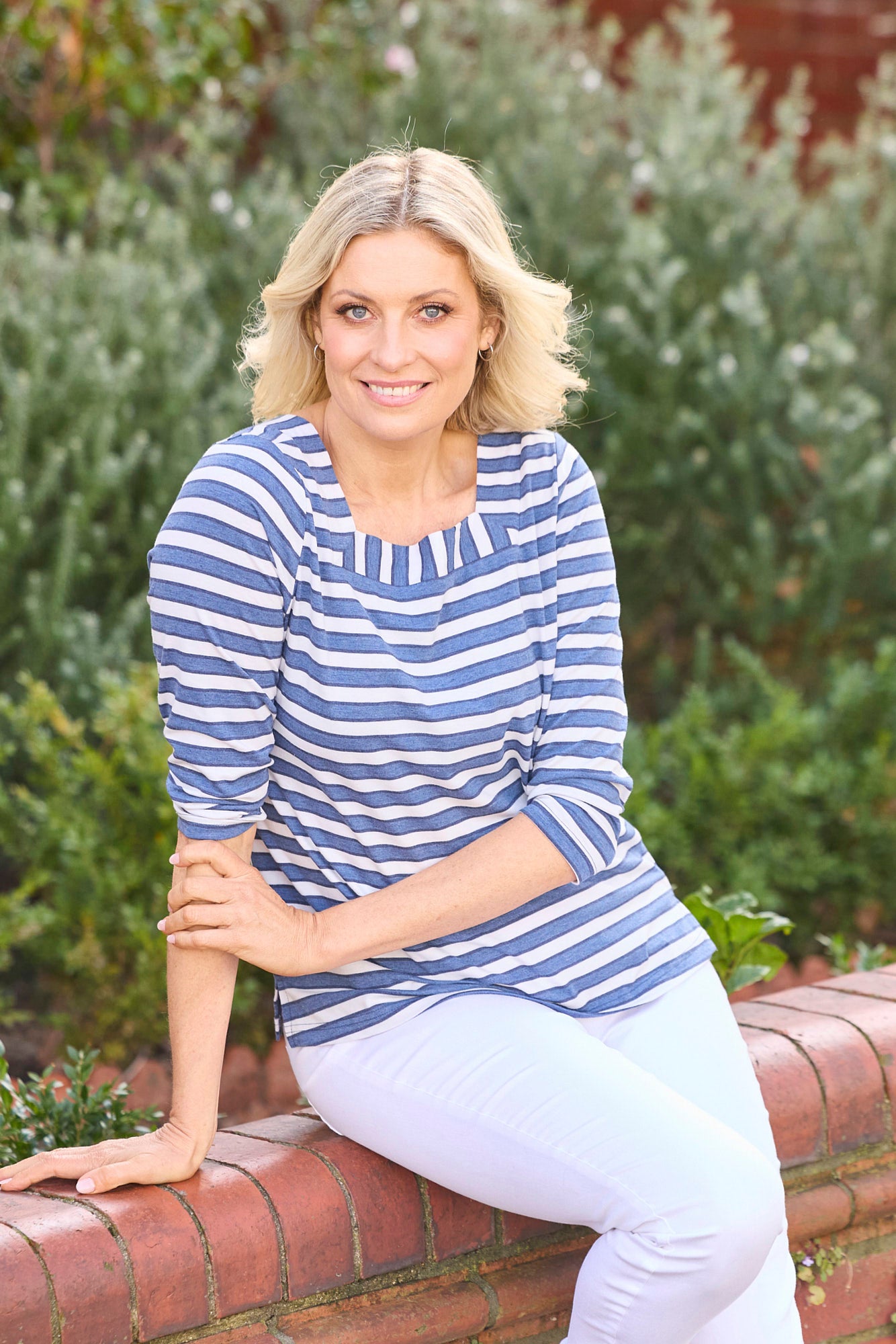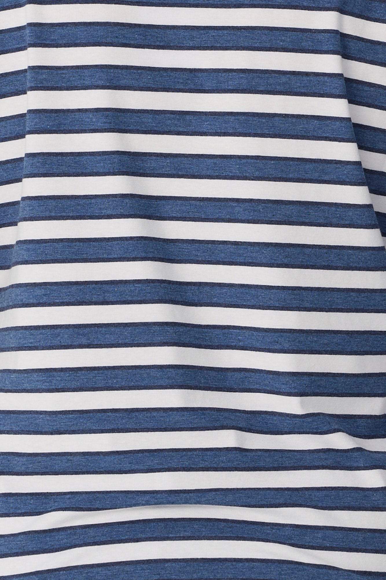 Crafted from a soft yarn-dye stripe fabrication with added stretch, it offers a gentle, flexible fit that moves with you. The set-in sleeves and 3/4 length design provide both coverage and ease, while side hem splits enhance comfort and wearability. The neutral taupe base with navy stripes adds a subtle nautical flair that pairs seamlessly with your everyday pieces.