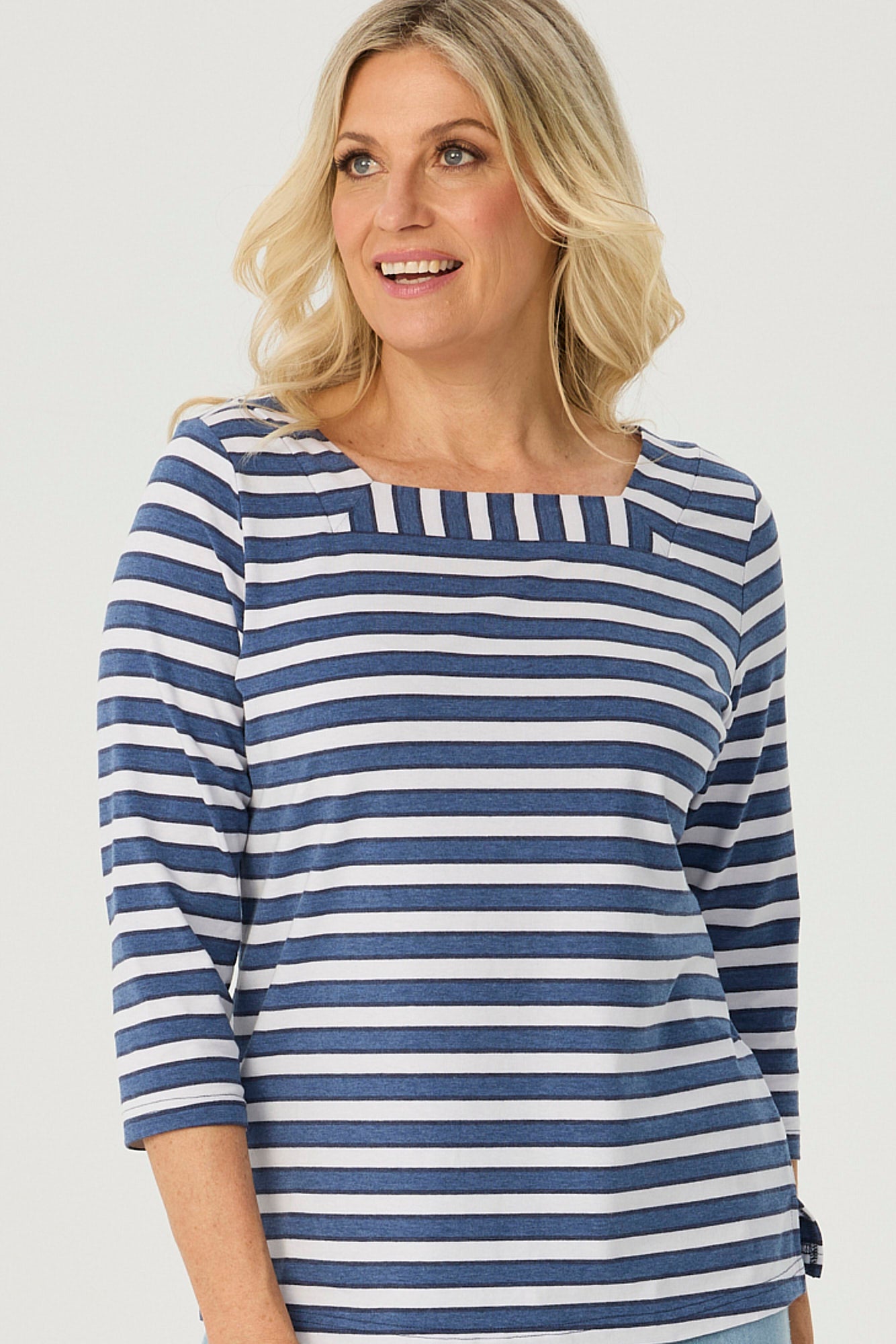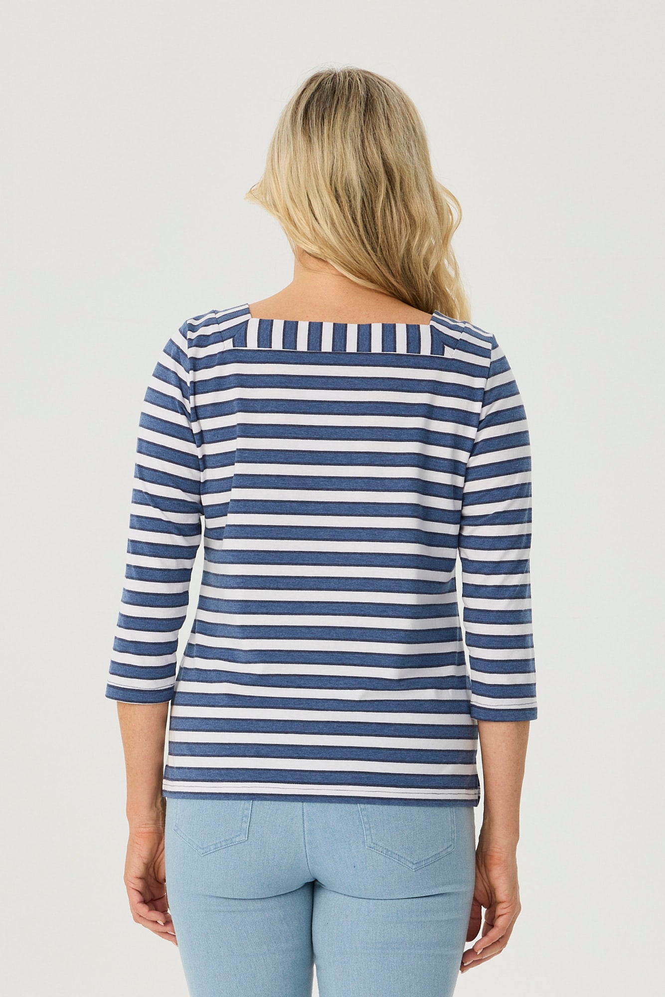 Effortlessly stylish and comfortable, the Action Square Neck 3/4 Sleeve Top in Indigo is a versatile essential for any wardrobe. Featuring a flattering square neckline with contrast neck bind, this tee adds a modern touch to a timeless silhouette.