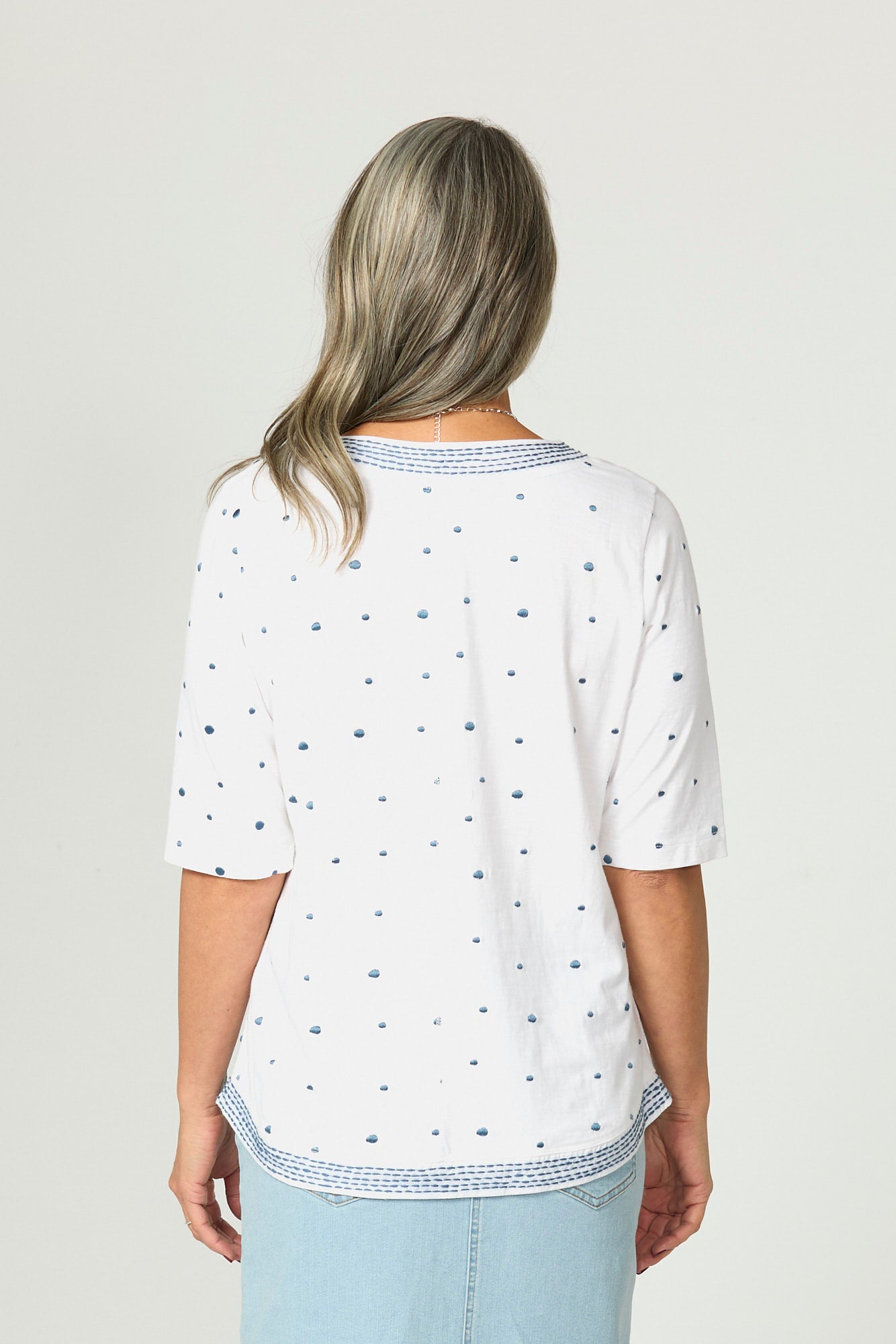 Refresh your wardrobe with the playful charm of the Addison Elbow Sleeve Spot Top in White/Blue. Featuring a classic polkadot print, this breezy style is accented with stitched trim detailing for added character. The wide neckline and elbow-length sleeves create a flattering shape, while the set-in sleeve ensures a polished finish perfect for casual or elevated looks.