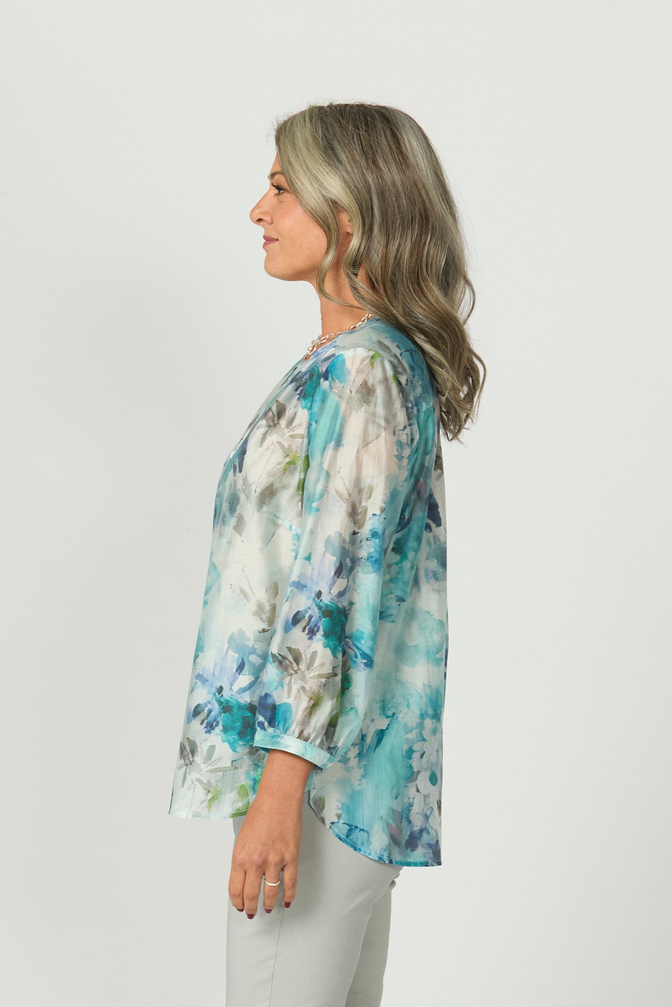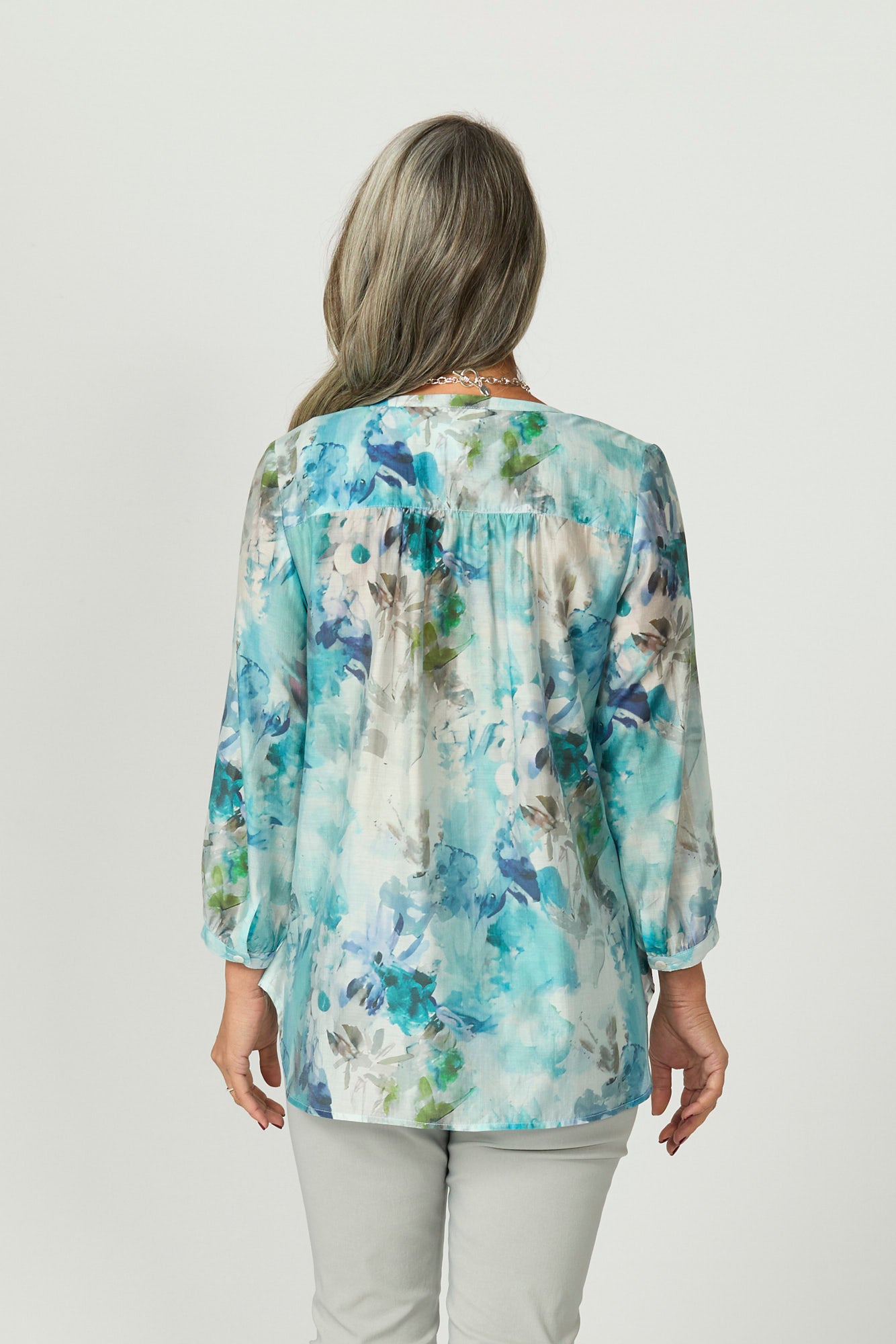 Step into soft elegance with the Alyssa Collarless 3/4 Sleeve Shirt in Blue Mix. Made in Australia and adorned with a delicate watercolour floral print, this shirt combines feminine charm with everyday comfort. The gathered cuffs and flowing curved hem offer a graceful finish to its relaxed silhouette.