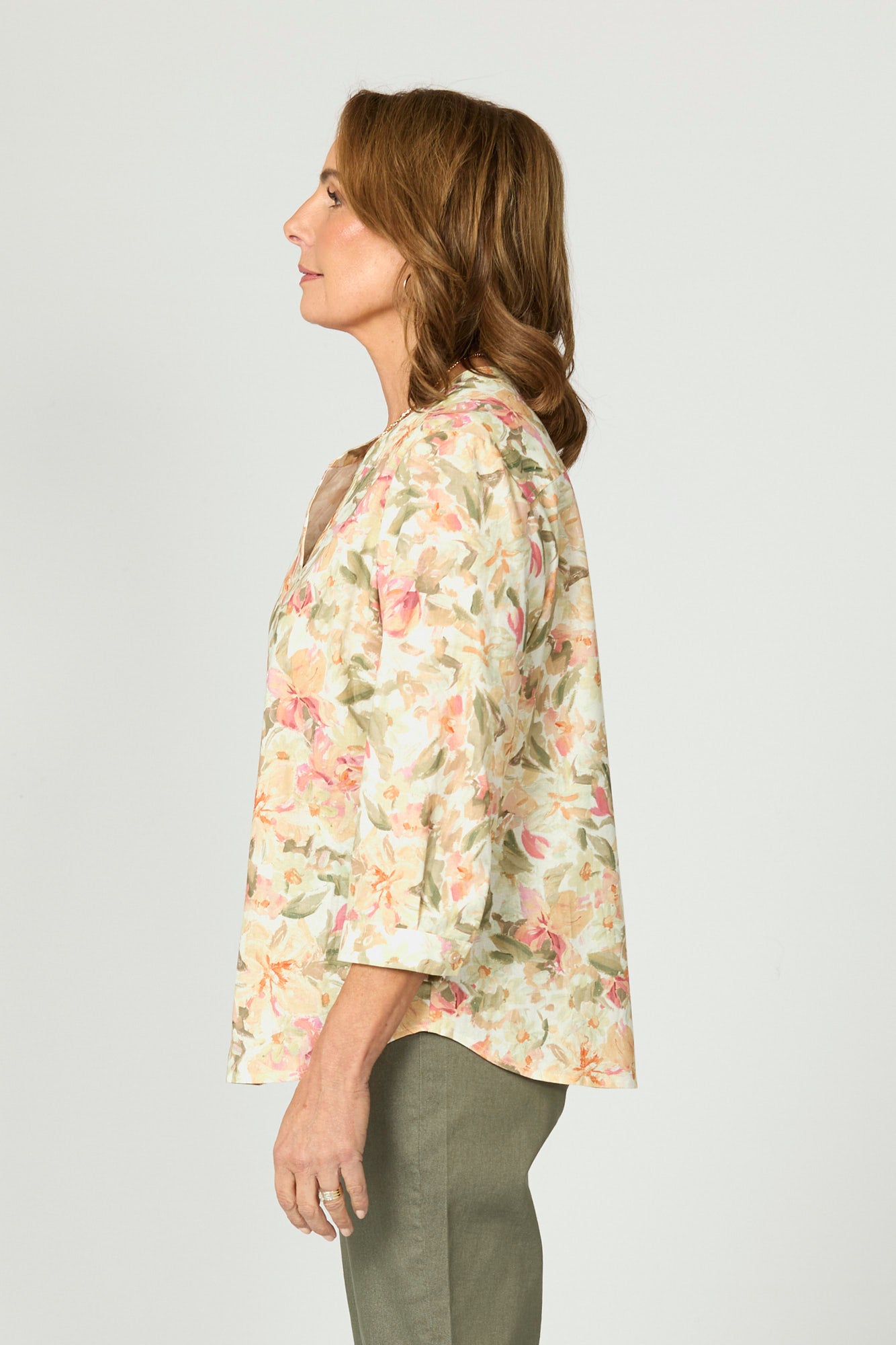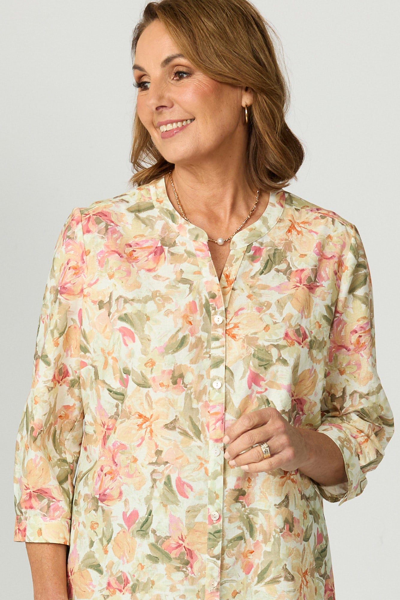 Brighten up your day with the Bianca Collarless 3/4 Sleeve Shirt in Sage Multi. Made in Australia, this floral-printed shirt blends soft structure with feminine detail. The round neckline with V insert adds a modern touch, while cuffed set-in sleeves and gentle shaping through the back pleat and curved hem offer a flattering finish.