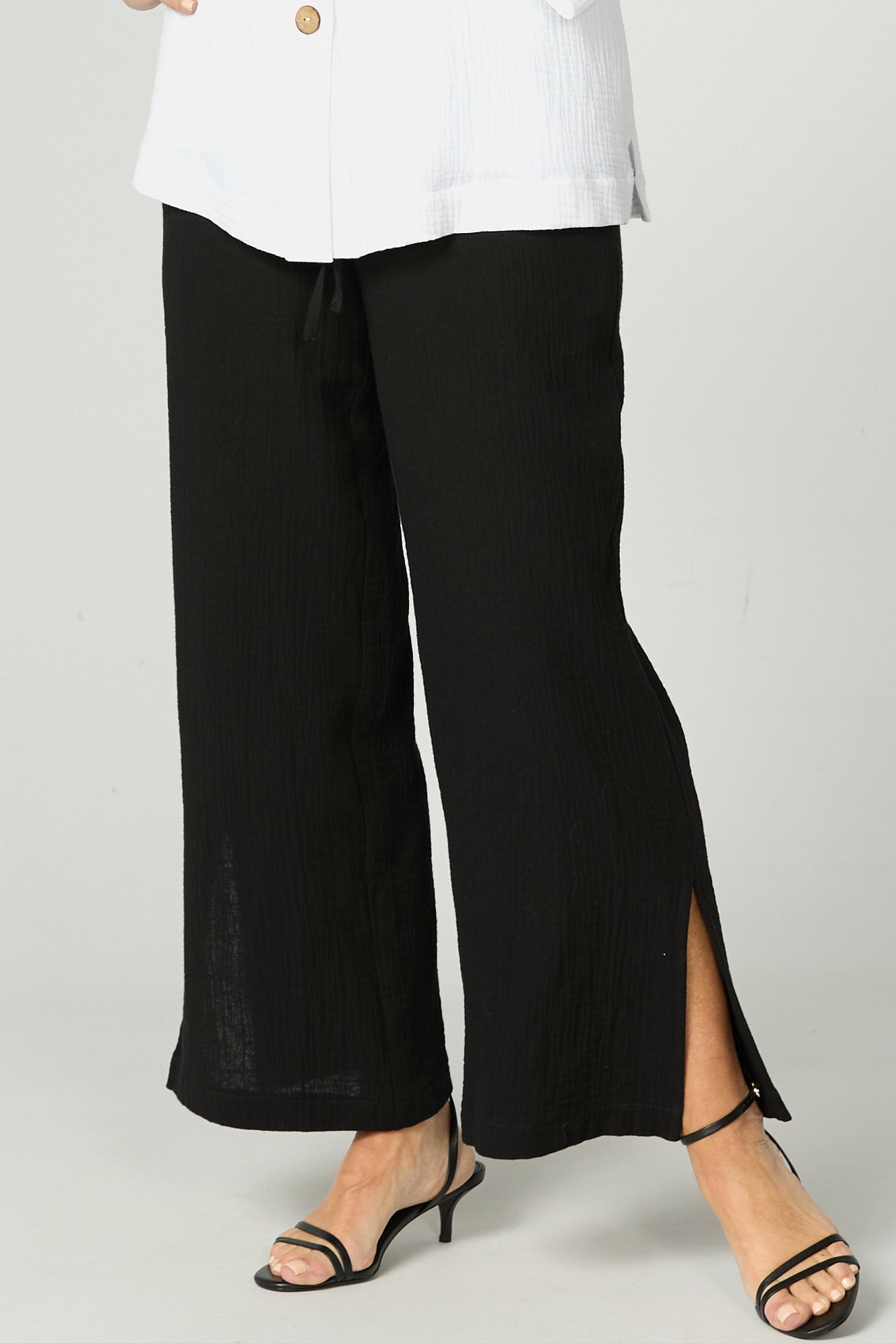 Step into everyday comfort with ease in the Bubble Long Pant with Splits in Black. Made in Australia from 100% cotton, these pants offer breathable wear with a stylish edge. Designed for movement and versatility, they feature a long leg length with side hem splits, while the elasticated waist with tie closure ensures a perfect fit every time.