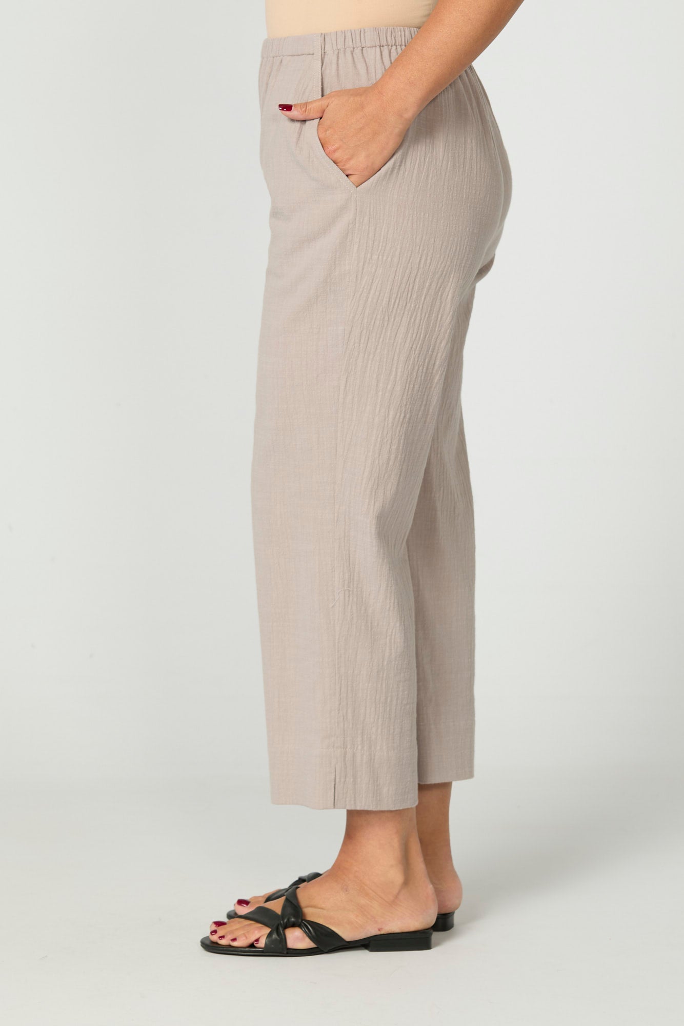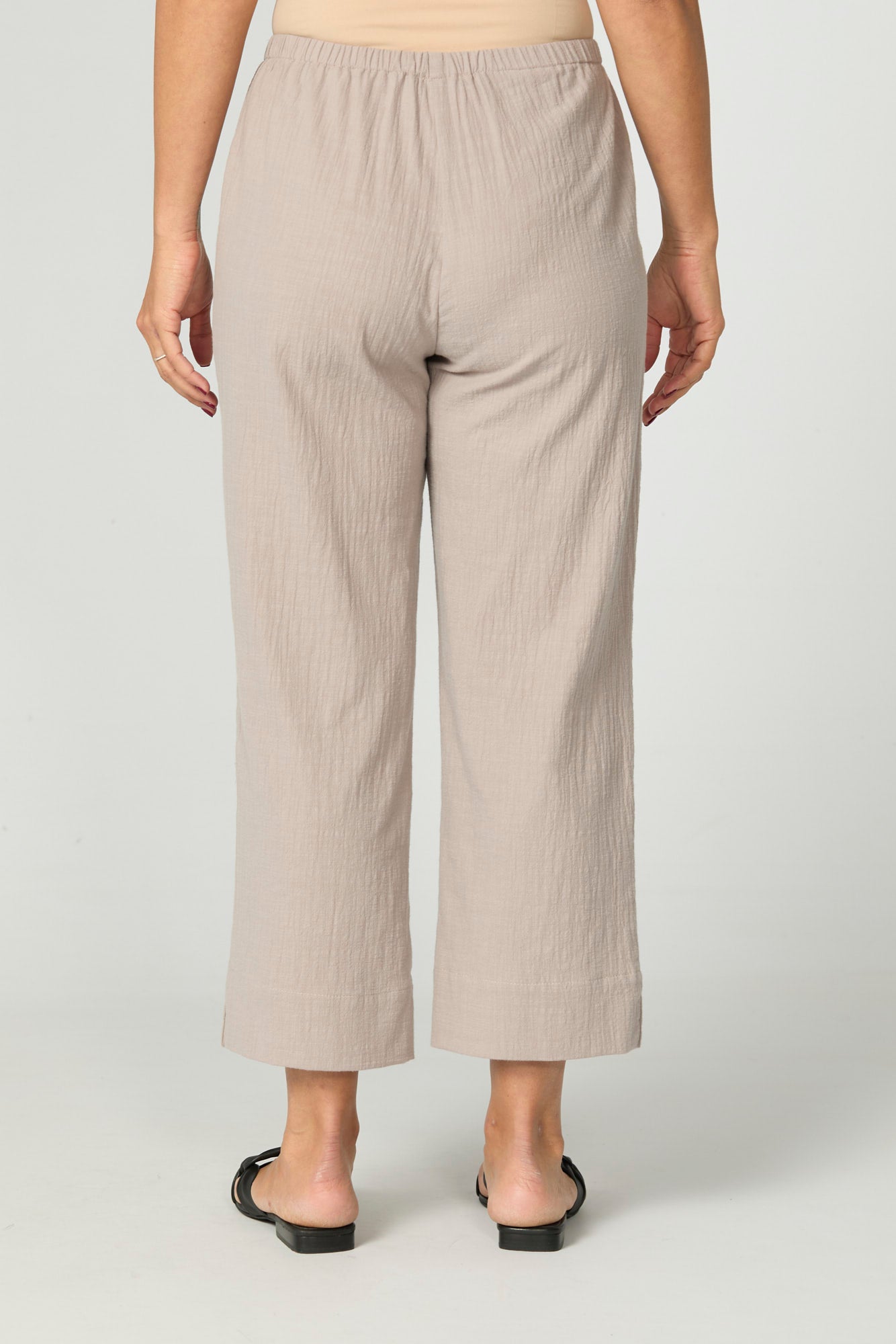 Discover breezy comfort and effortless style with the Cable Beach Crop Pant in Putty. These relaxed wide-leg pants feature a cropped length perfect for warm weather, while the elasticated waist ensures a snug fit. The lightweight cotton fabric provides breathable comfort, and the hem side splits add a playful touch. With front side inner pockets, these pants are as practical as they are stylish.