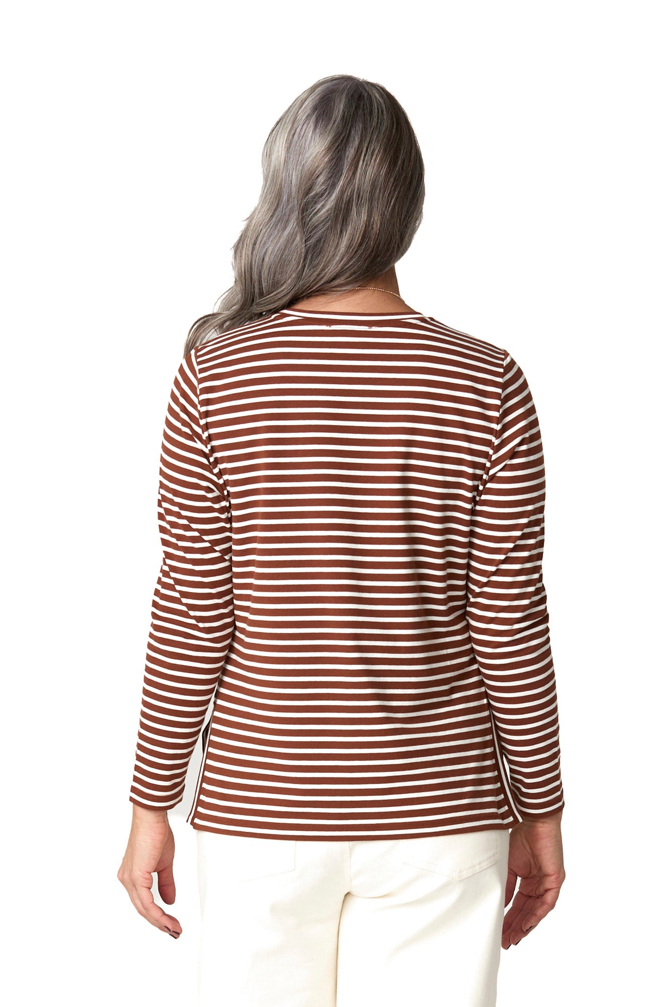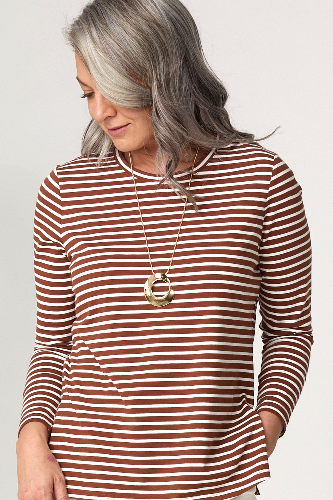 Discover the nautical elegance with the Caz Stripe Top in Cognac/Ivory, a lightweight jersey striped tee that perfectly captures the essence of maritime style. The all-over nautical stripe design, paired with contrast side splits, offers a chic look, while the set-in sleeve, round neck, and long sleeve construction ensure a classic fit. Crafted with stretch for comfort, this top is as versatile as it is stylish, making it a must-have for your wardrobe.