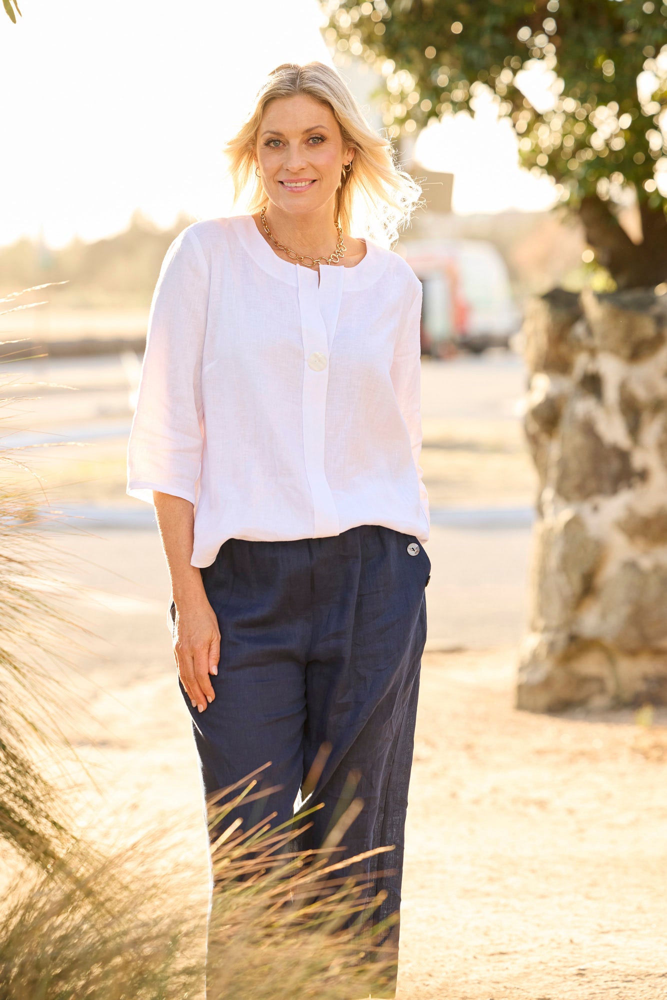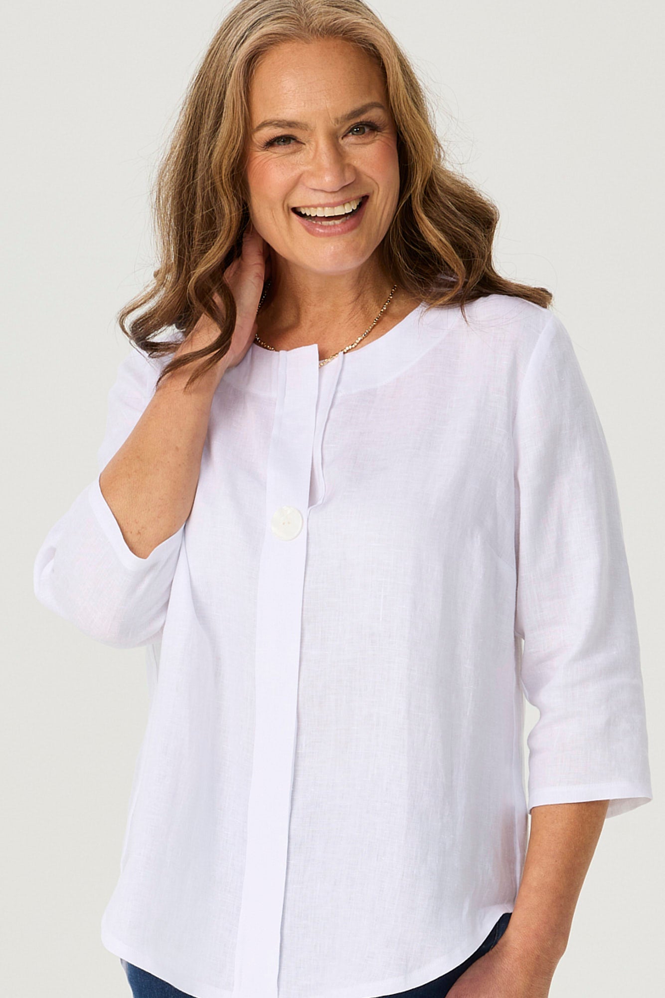 Proudly made in Australia, the Cologne 1 Button Tunic Top combines effortless style with thoughtful detailing. Crafted from breathable, lightweight linen, it offers a relaxed yet refined silhouette perfect for all-day wear. The collarless neckline and concealed placket are finished with a single statement button, creating a clean, modern look. Designed for comfort and versatility, this tunic features an elasticated waist for ease of movement, front side pockets with feature button detailing, and a wide hem with side splits for a flattering drape. The crop length pairs beautifully with both high-waisted pants and skirts, making it a go-to piece for any season.
