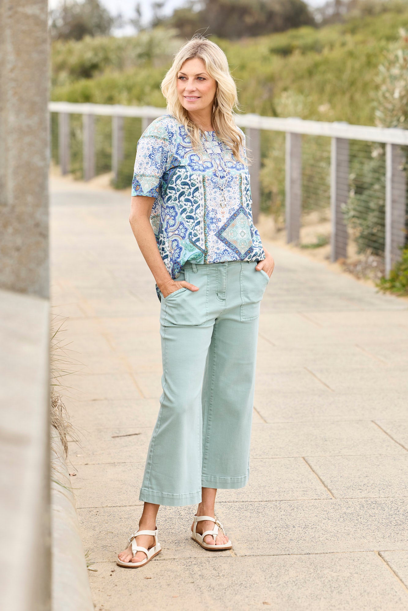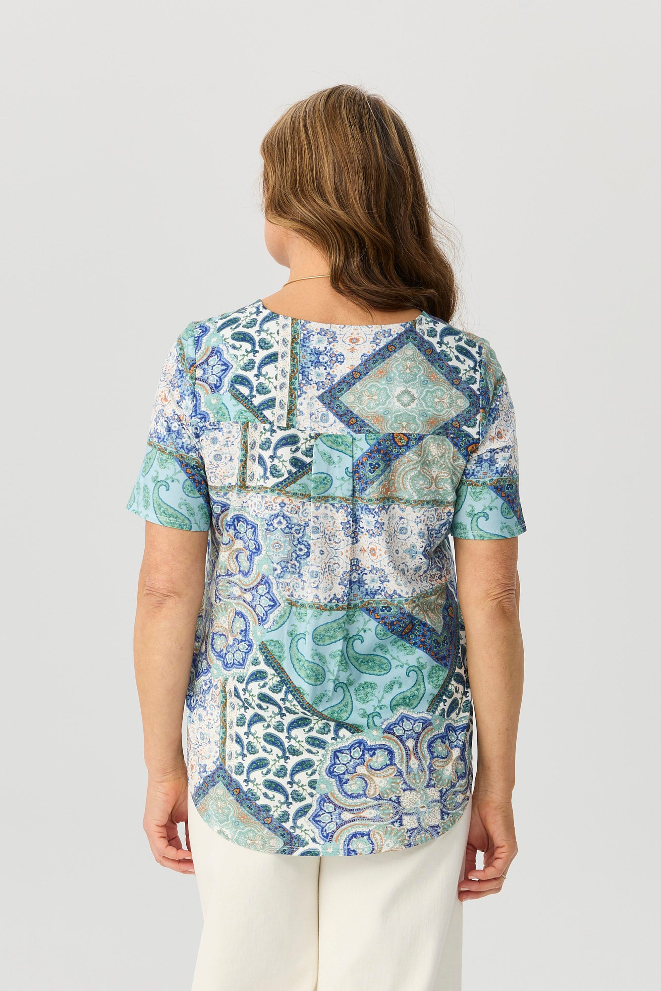 Refresh your casual style with the Corfu Skies Pleat Back S/S Tee in Blue Mix. Featuring a captivating patchwork paisley print, this tee blends artistic flair with everyday comfort. The soft stretch jersey fabrication drapes beautifully, while a curved hem and pleat back add gentle movement and shape to your silhouette. Ideal for easy, stylish dressing any day of the week.