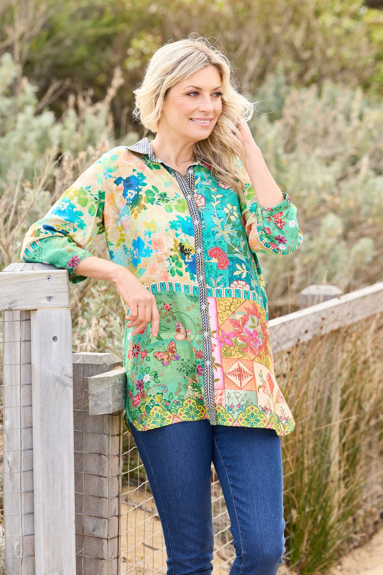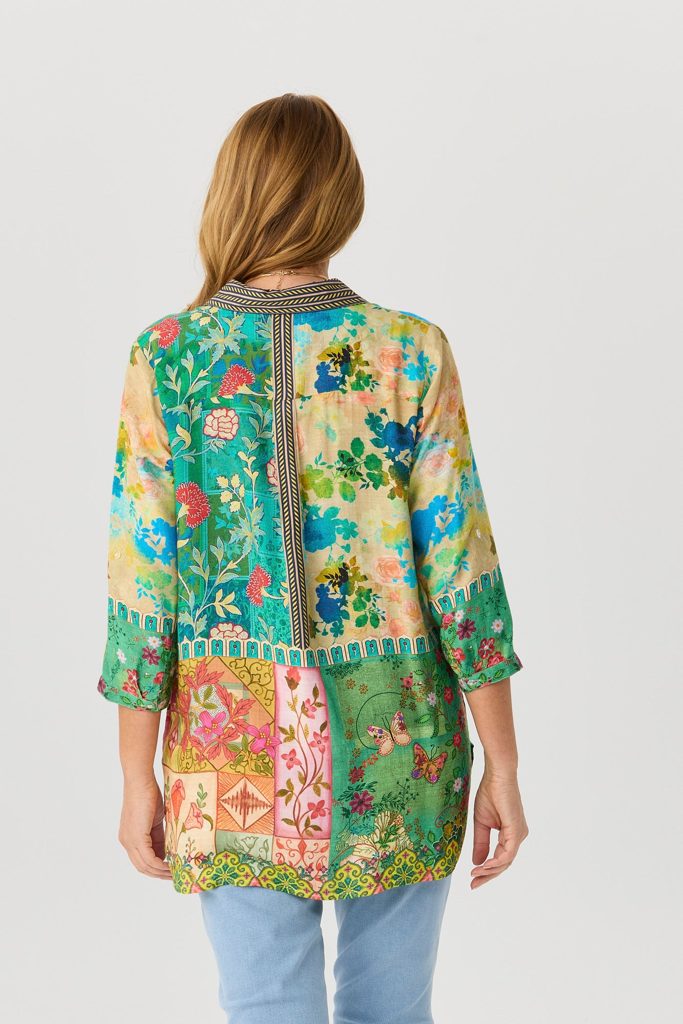 Brighten up your wardrobe with the Dandy Relaxed 3/4 Sleeve Shirt in Multi Tile. Featuring a playful patchworked floral print, this relaxed-fit shirt blends charm and comfort effortlessly. Contrast detailing at the collar and placket adds a stylish edge, while rolled cuffs with tab button closures and curved hems provide a laid-back finish.