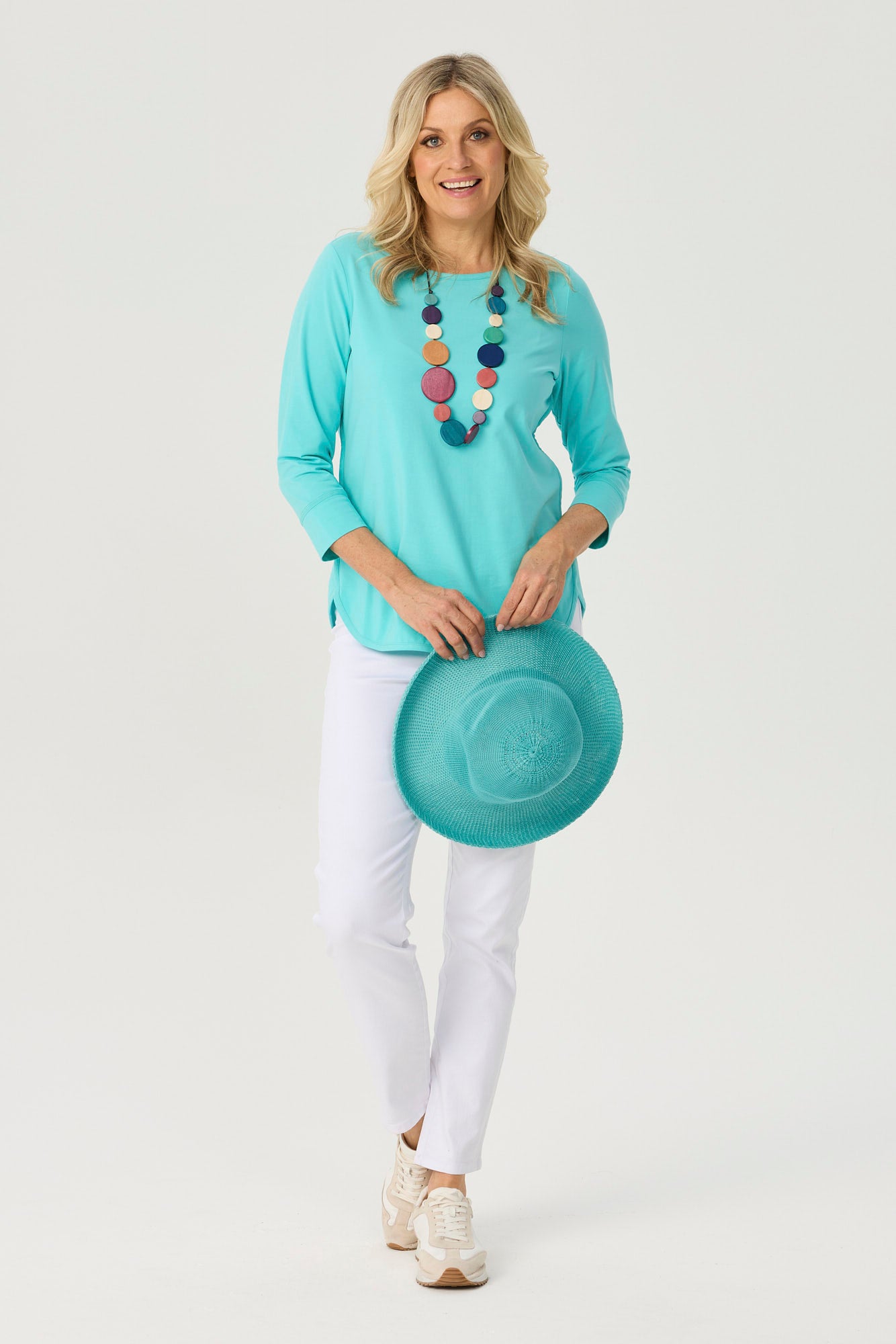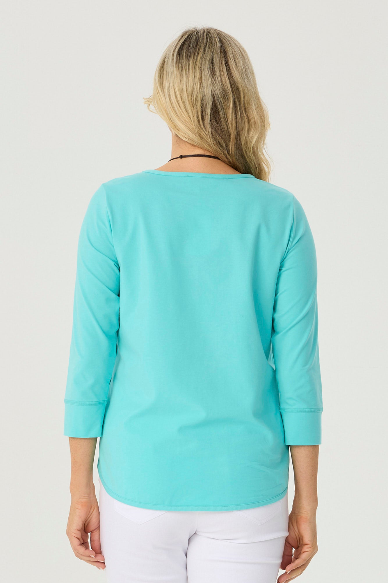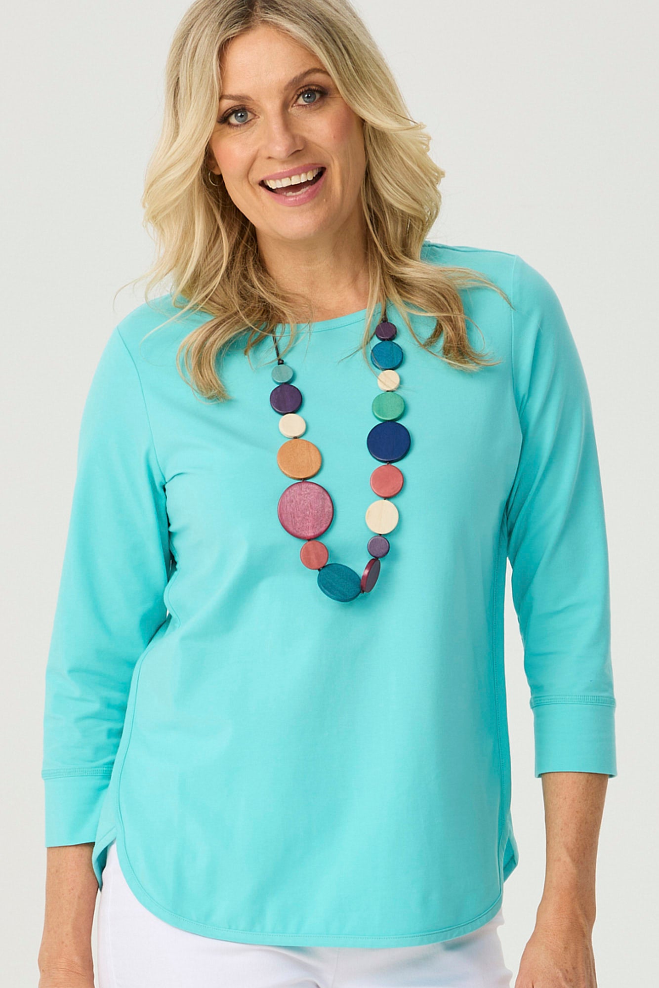Dive into the deep, mesmerizing hue of the Aqua Eternity Bind Top. This essential top, crafted from a luxurious blend of stretch cotton and modal, offers unparalleled comfort and style. The 3/4 length sleeves are accentuated with generous binding at the edge, adding a contemporary touch to its timeless design. The curved hemline gracefully flatters the silhouette, while the round neckline ensures a classic look. Perfect for both casual days and elegant evenings, this Aqua Eternity top is a testament to enduring fashion.