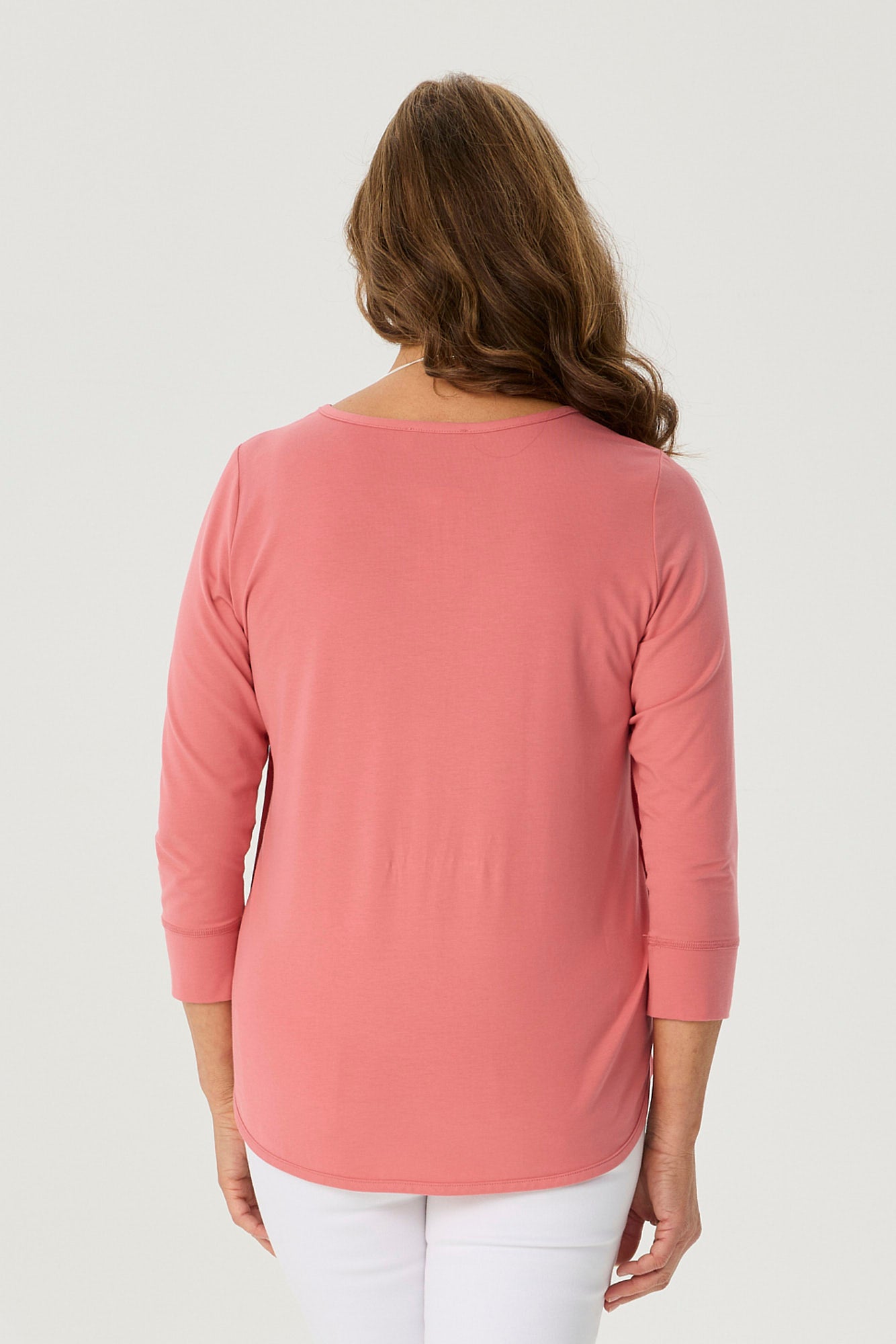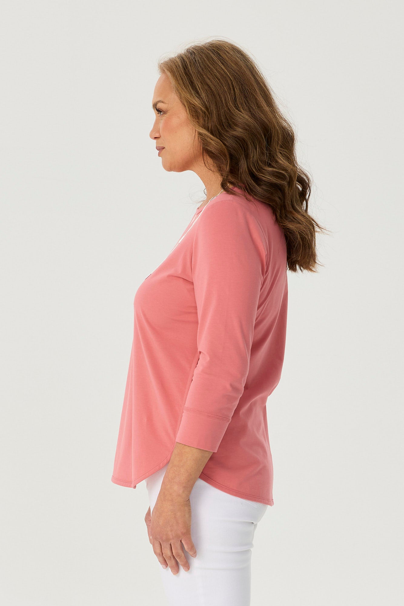 Dive into the deep, mesmerizing hue of the Papaya Eternity Bind Top. This essential top, crafted from a luxurious blend of stretch cotton and modal, offers unparalleled comfort and style. The 3/4 length sleeves are accentuated with generous binding at the edge, adding a contemporary touch to its timeless design. The curved hemline gracefully flatters the silhouette, while the round neckline ensures a classic look. Perfect for both casual days and elegant evenings, this Papaya Eternity top is a testament to enduring fashion.