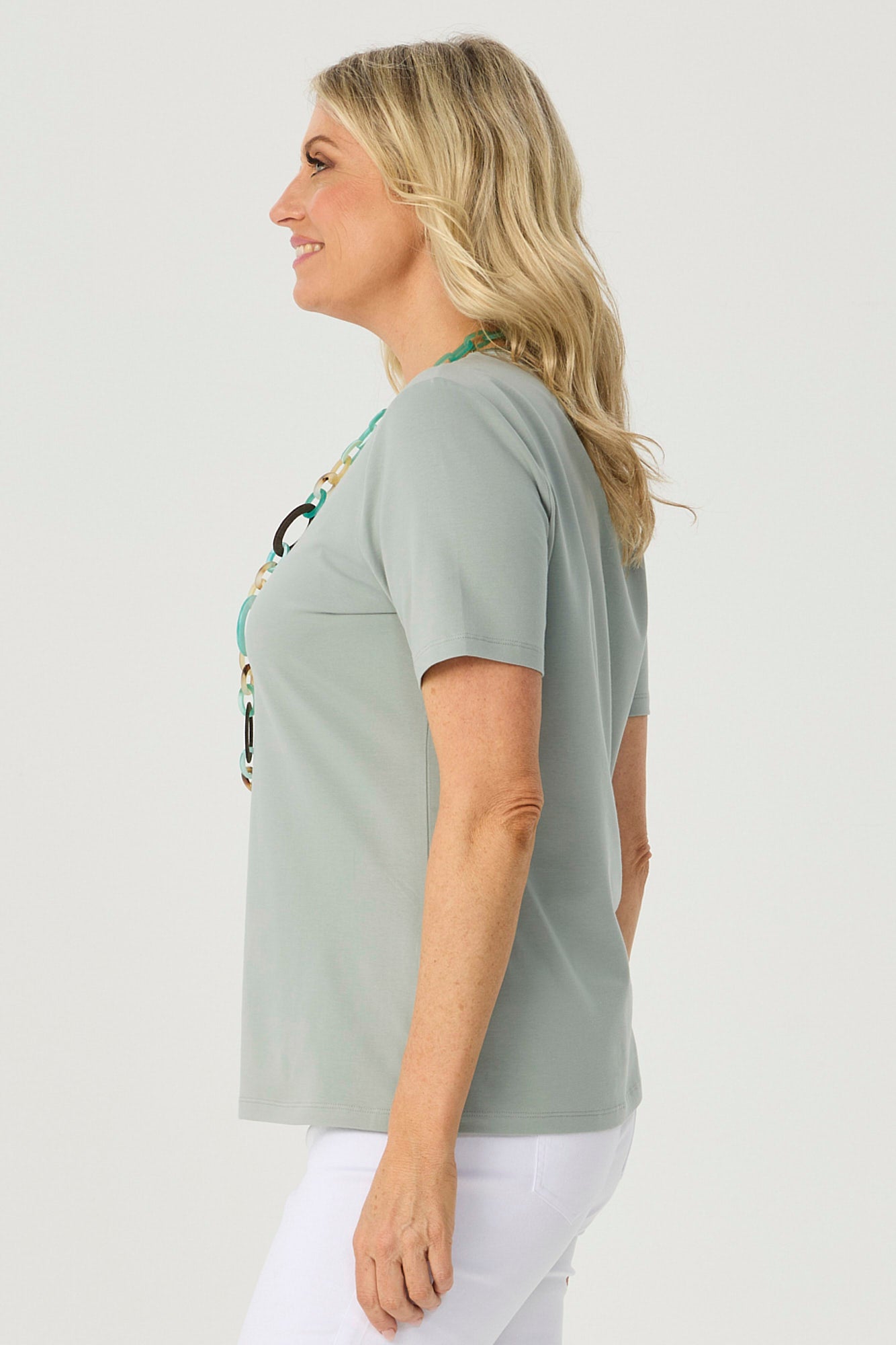 Enhance your wardrobe essentials with the Everyday Ribbon Trim S/S Tee in Sage. This classic tee features short sleeves, a scoop neck with a curved neckline, and a ribbon trim, offering a sophisticated look.