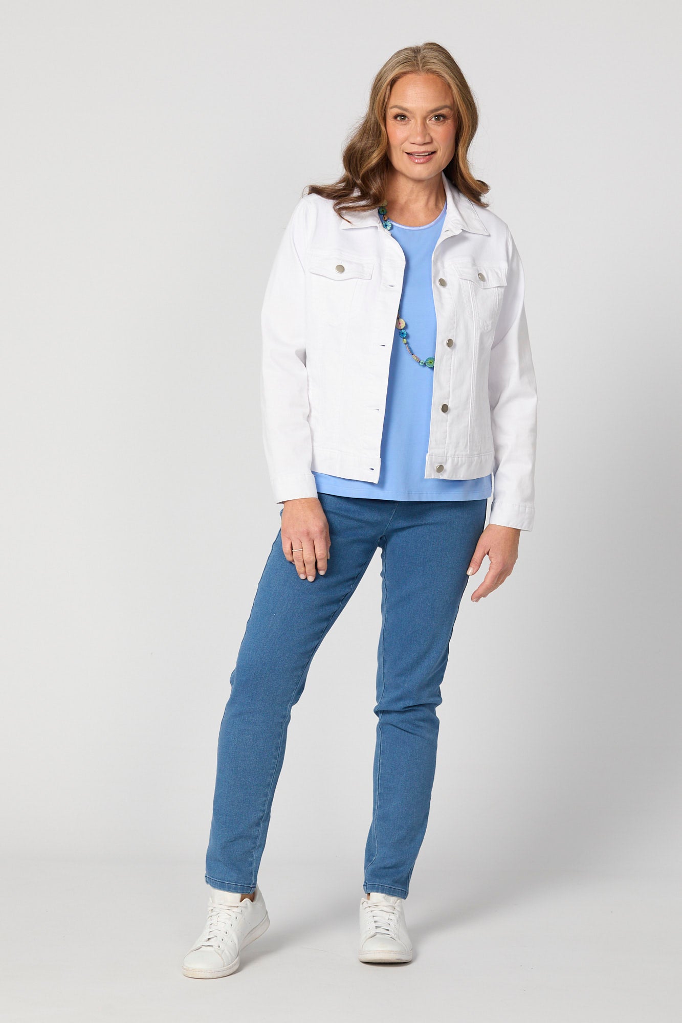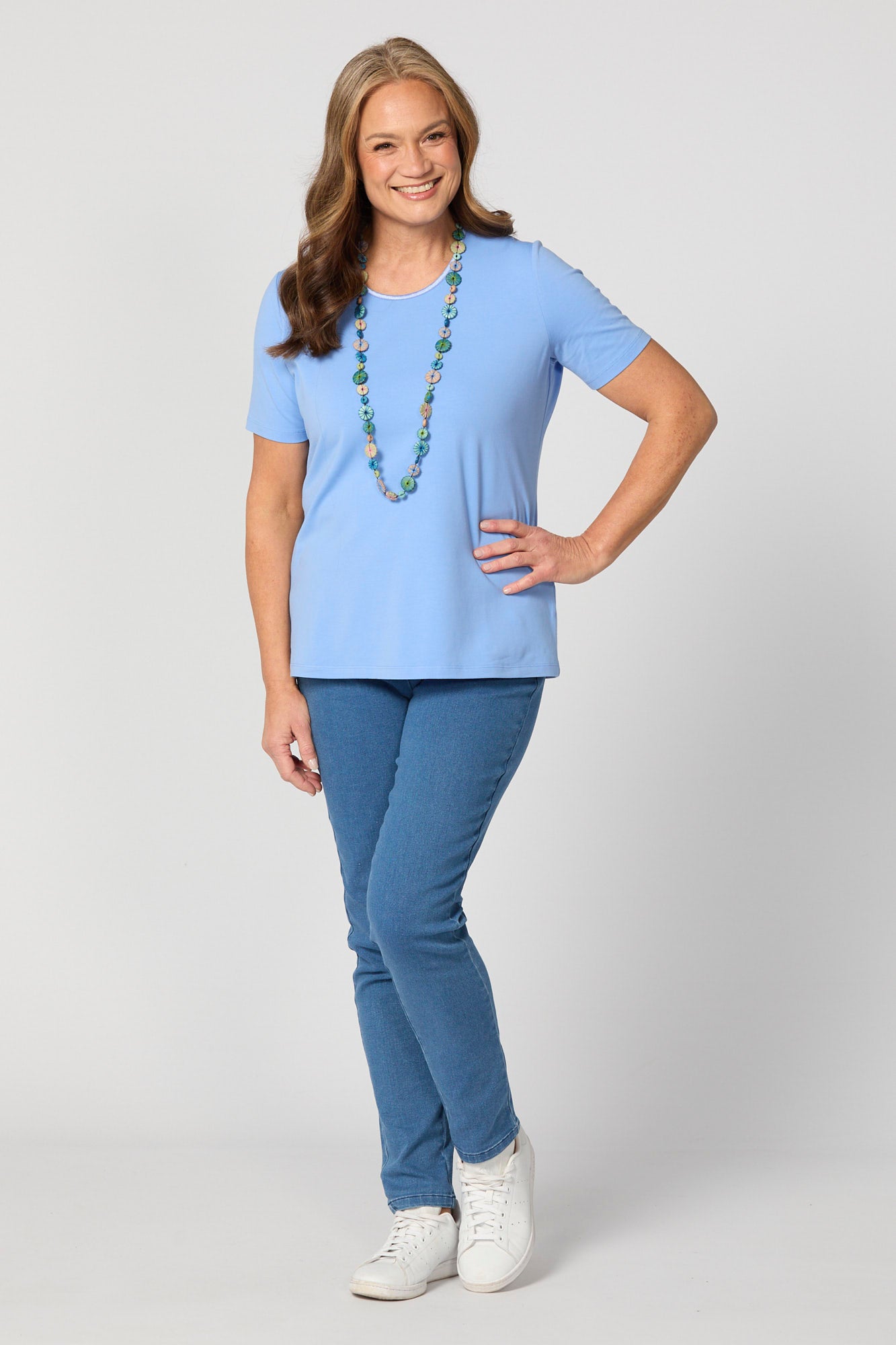 Enhance your wardrobe essentials with the Everyday Ribbon Trim S/S Tee in Sky Blue. This classic tee features short sleeves, a scoop neck with a curved neckline, and a ribbon trim, offering a sophisticated look.