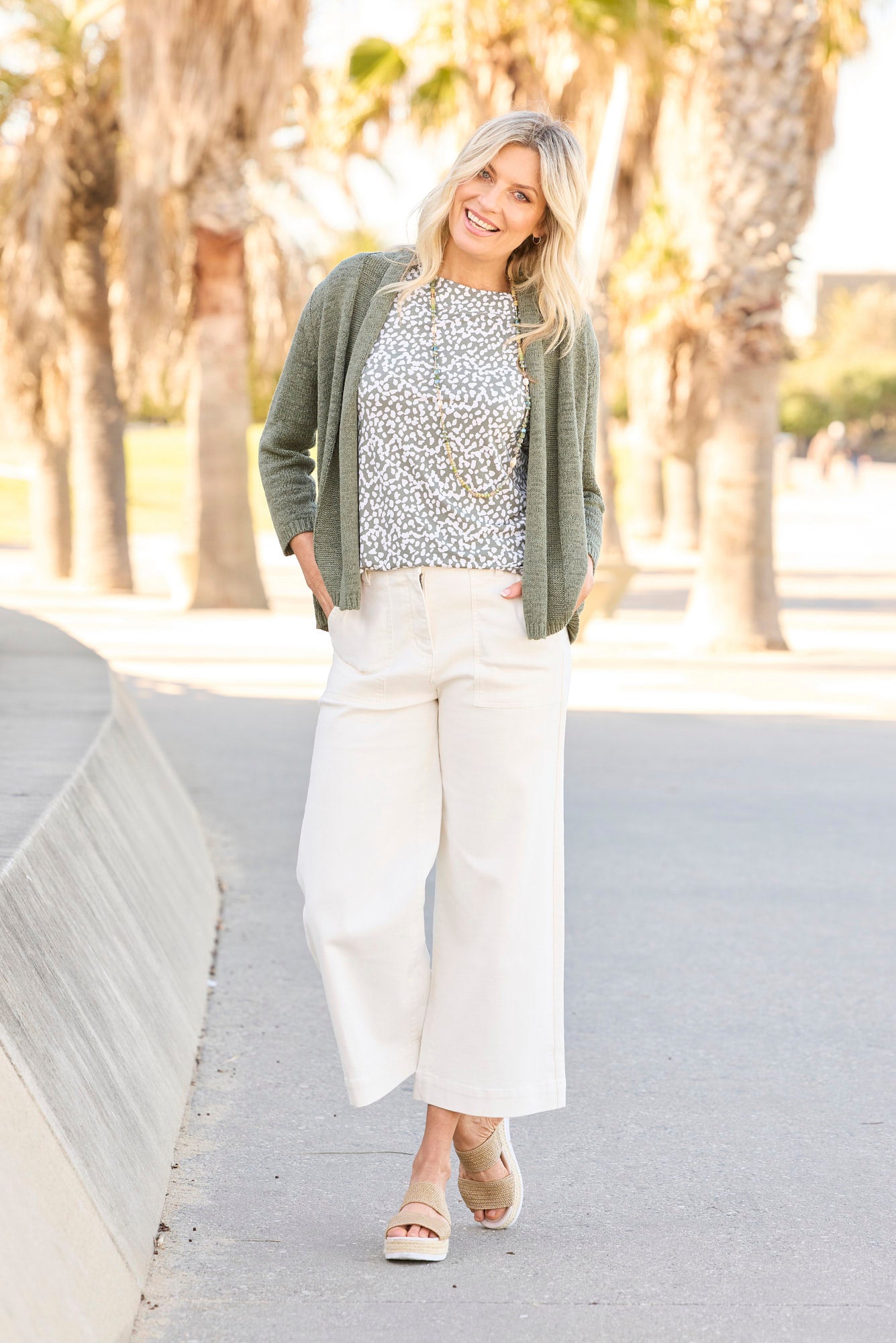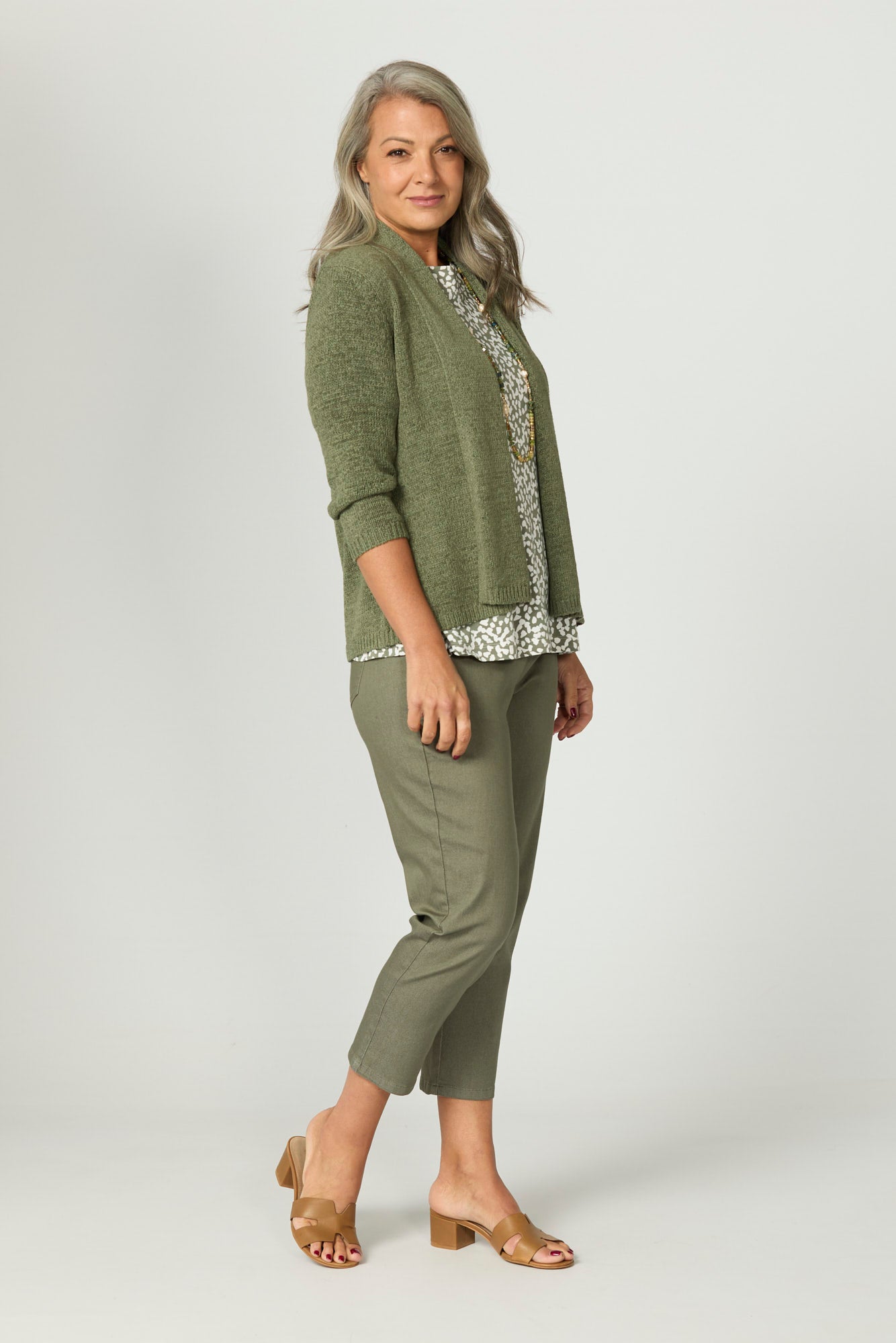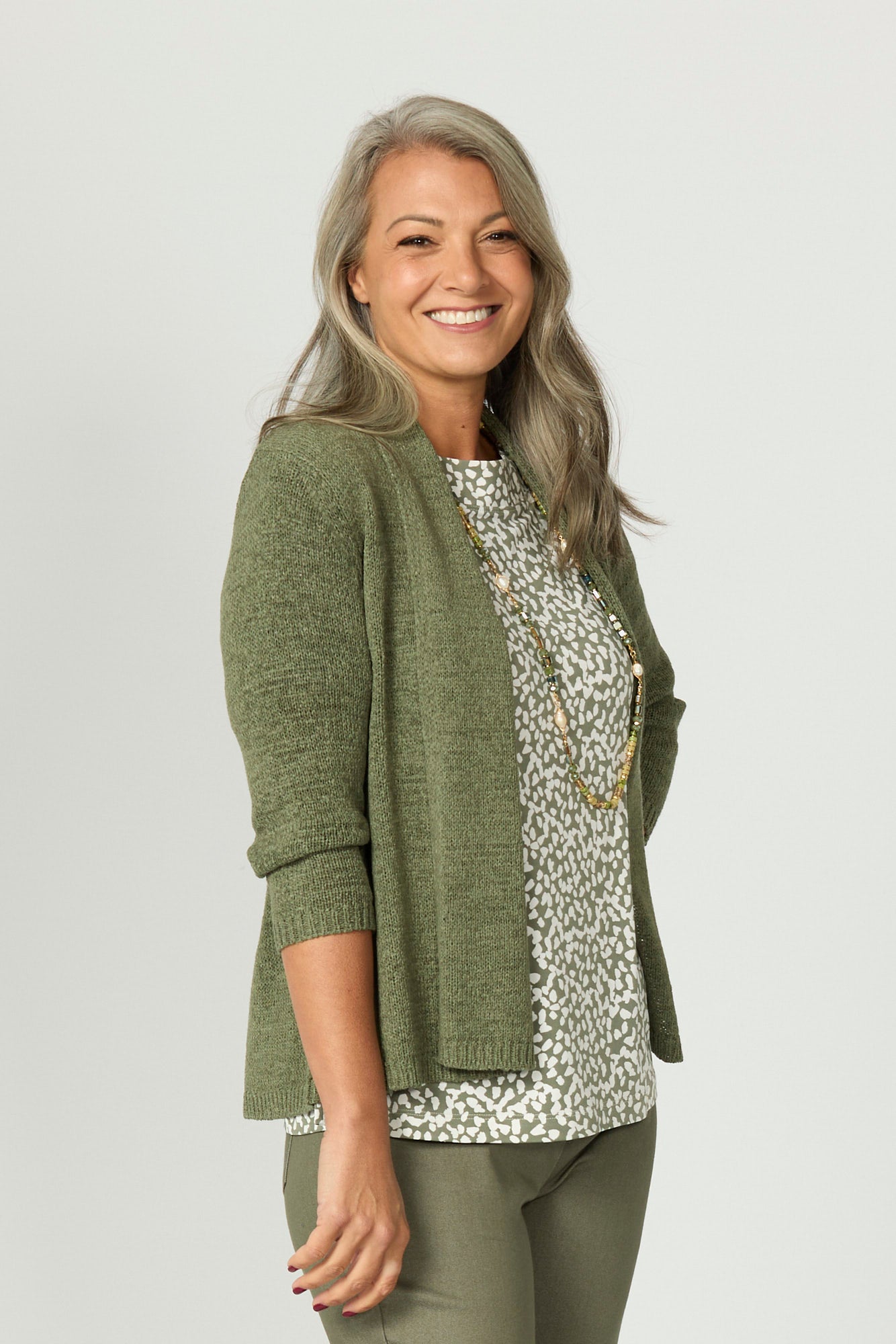 Layer with ease in the Fremantle E2E Tape Yarn Cardi in Olive. This relaxed-fit cardigan features a breathable tape yarn knit that offers texture and style in equal measure. With its open edge-to-edge front and comfortable 3/4 sleeves, it's the perfect lightweight layer for effortless dressing.