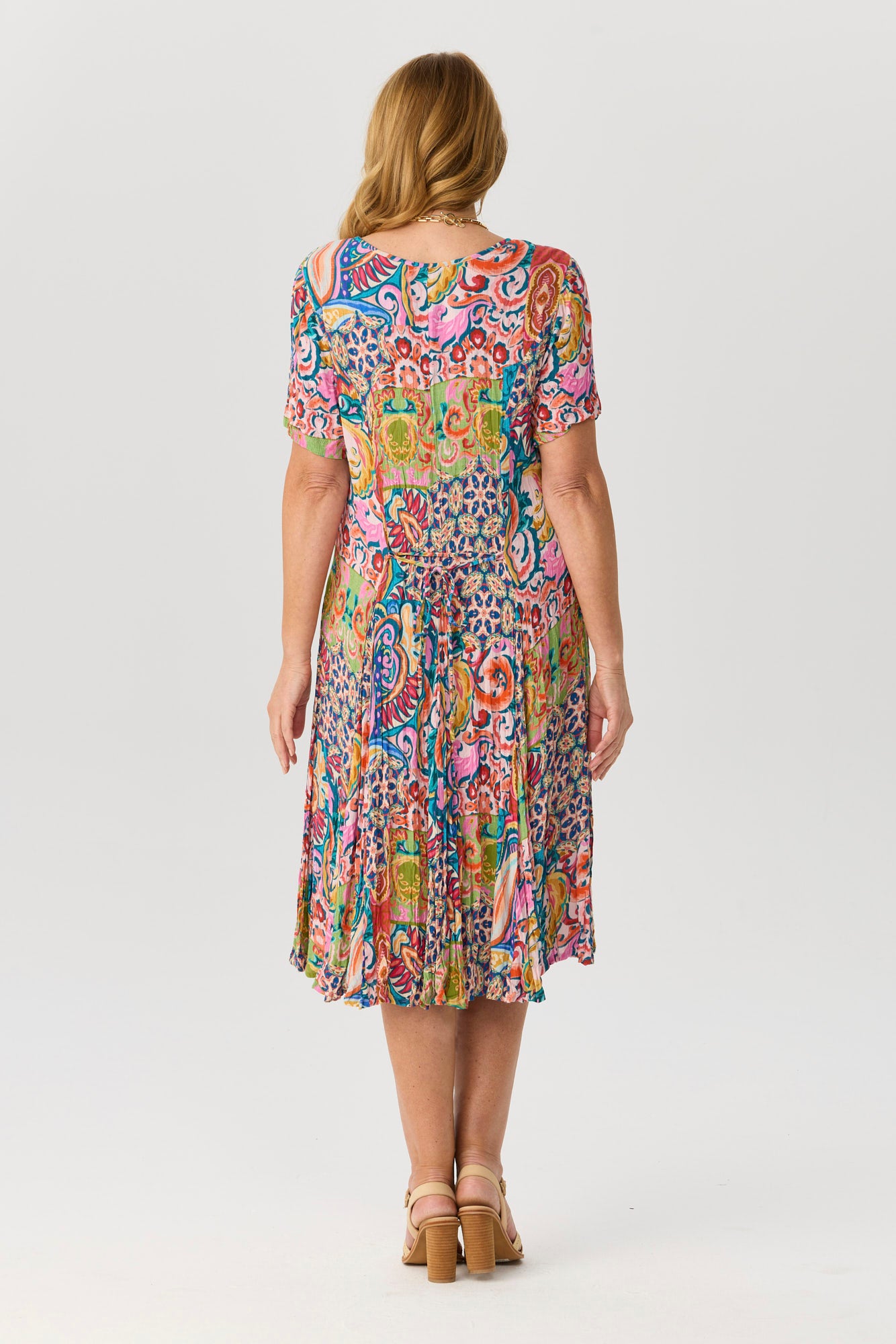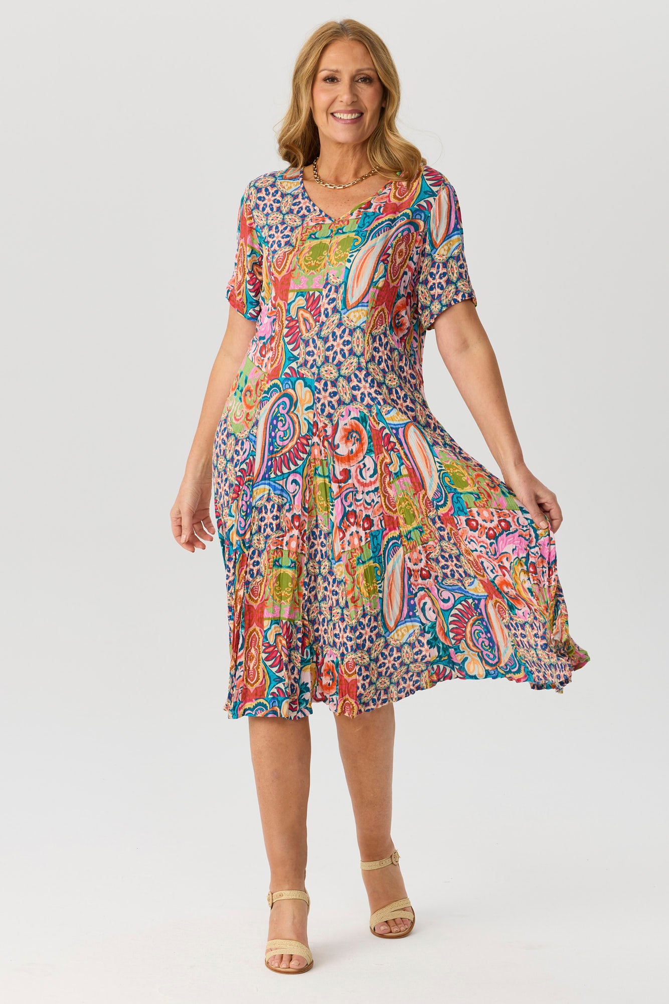 Embrace effortless elegance with the Godet Short Sleeve Dress in Brights Paisley. Featuring a botanical print, this mid-length dress is designed with a flattering V-neckline and front panelling for a tailored fit. The short set-in sleeves and soft drape hand feel enhance its graceful silhouette, making it perfect for both casual and dressy occasions.