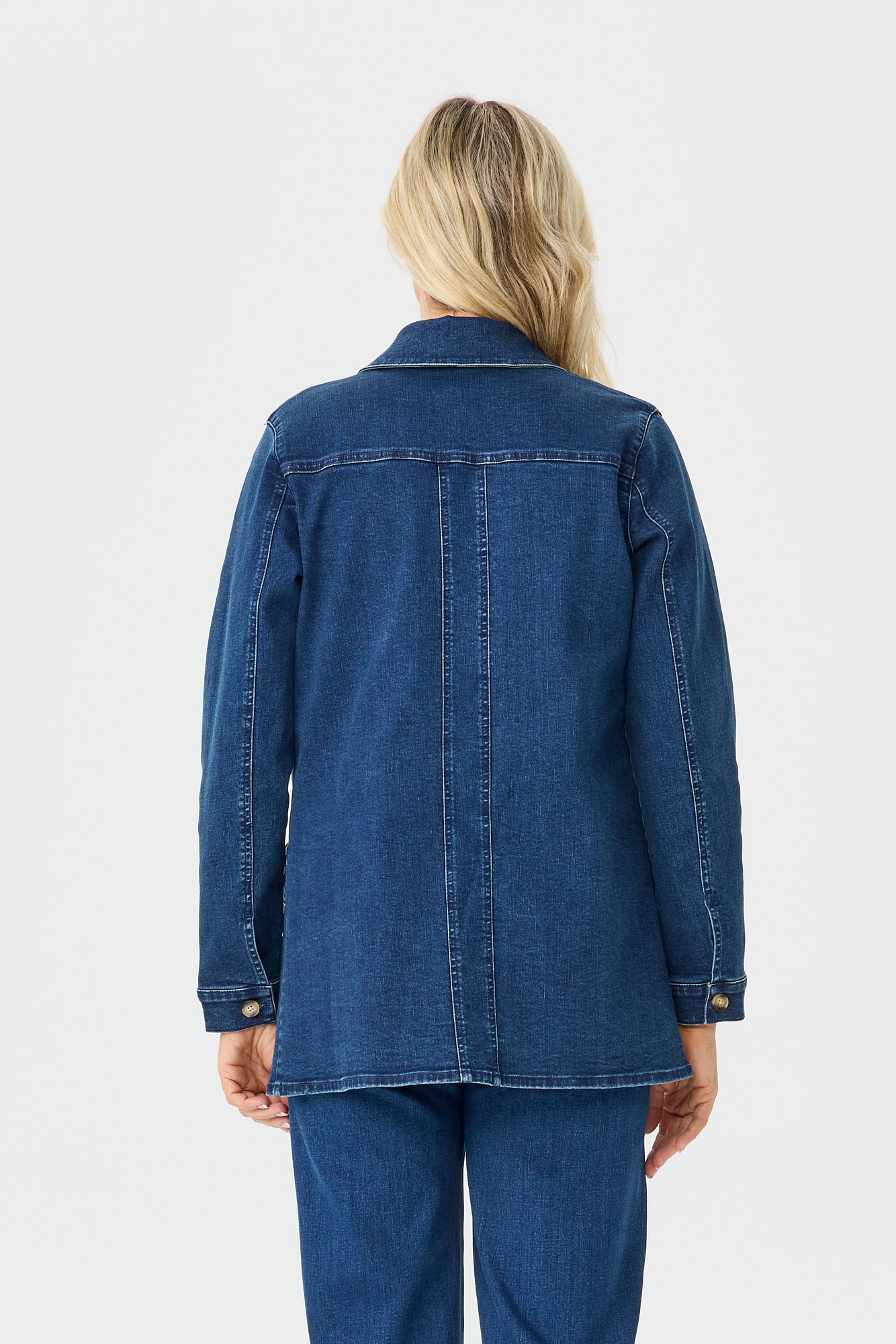 Refresh your outerwear collection with the Harper Denim Longline Jacket in Indigo. Designed for everyday versatility this classic denim layer blends structure with comfort thanks to its stretch fabrication. The longline silhouette offers flattering coverage while the collared neckline front yoke detailing and faux horn button closure bring timeless denim styling to this easy-to-wear wardrobe staple.
