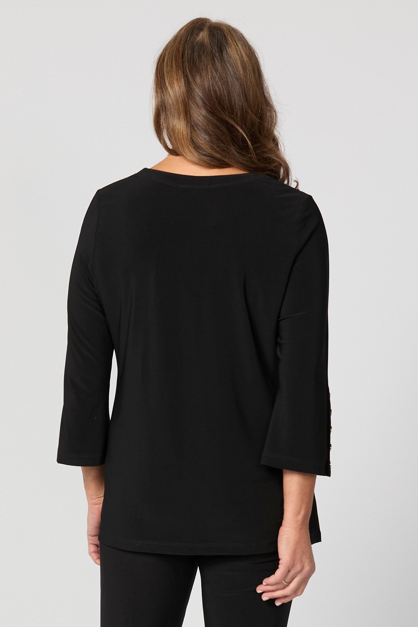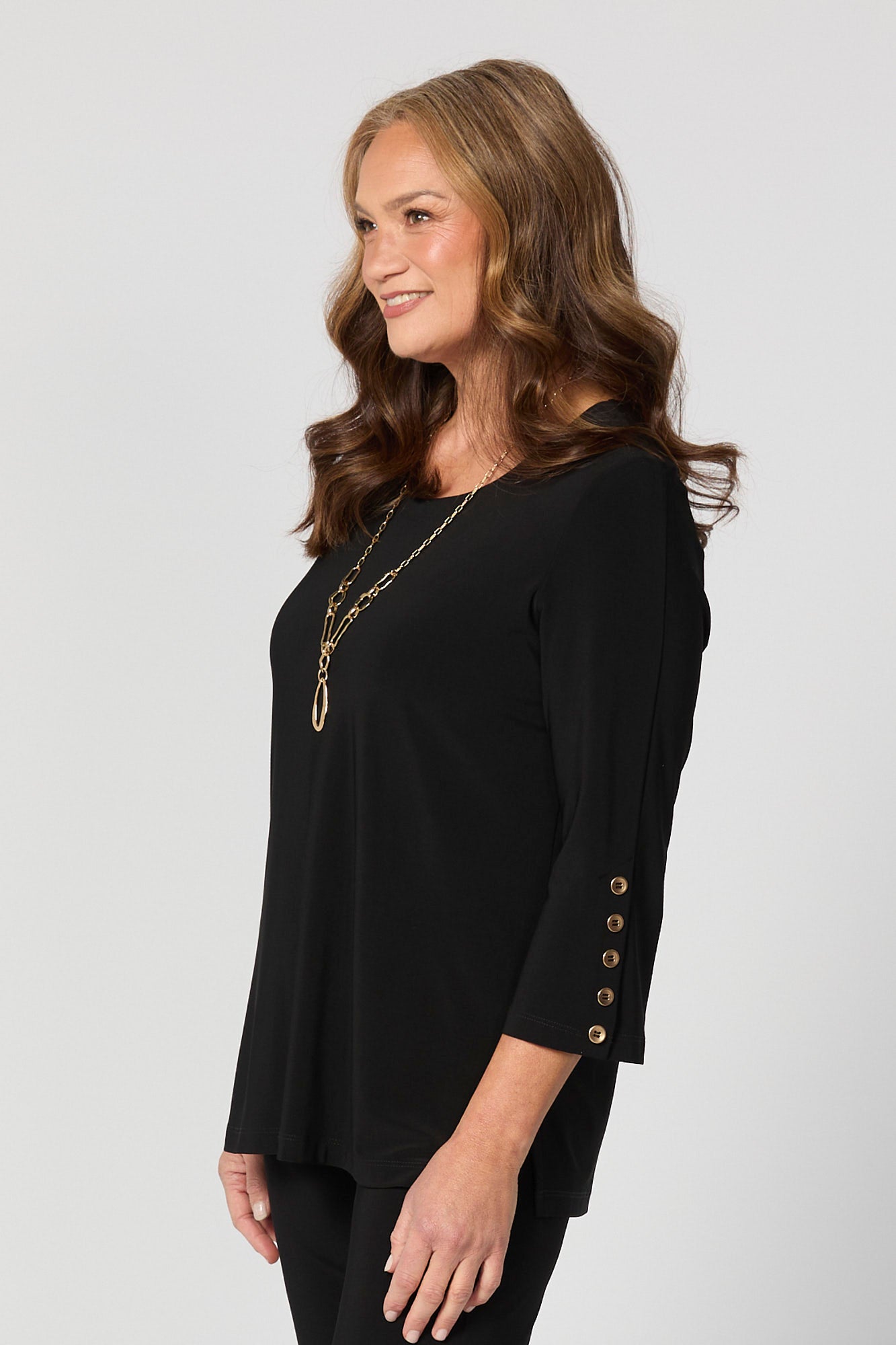 Add a touch of sophistication to your wardrobe with the Hush Fluted Button Sleeve Top in Black. Made in Australia, this top features a relaxed fit and elegant fluted sleeves with buttoned openings for subtle detail. The round neckline and side hem splits enhance its versatile appeal, making it perfect for both workdays and weekends.