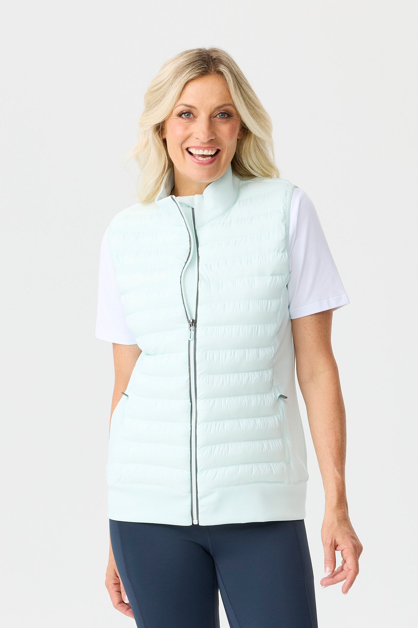The Hybrid Quilted Zip Vest in Mint is a item that delivers lightweight comfort for warm-weather days. The fabric feels lightweight, keeping the item comfortable against the skin during long wear. A collared neckline adds a clean, structured finish and keeps the upper line neat. Pockets keep small essentials close and reduce the need for a bag when you are on the move.