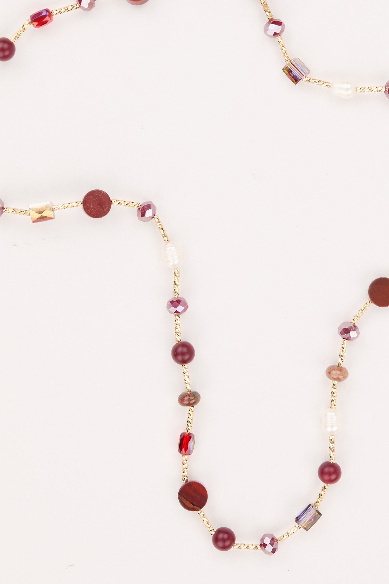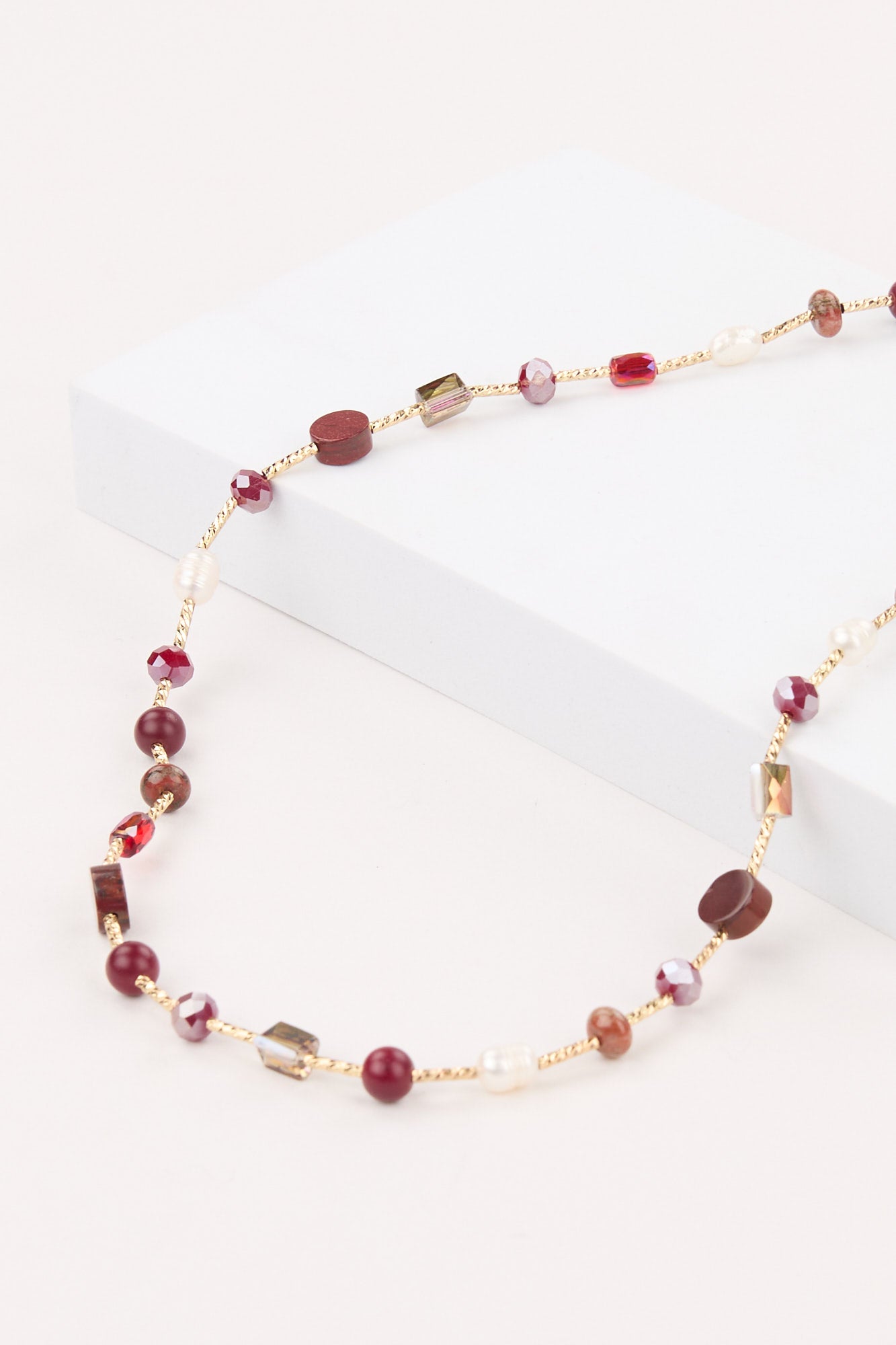 Step into sophistication with the Irene Long Necklace in Red/Gold, a striking piece that brings colour and elegance to any look. Featuring a rich blend of red, gold, pearl, and navy-toned beads in varying shapes and finishes, this necklace is both playful and refined. Its versatile longline style makes it ideal for layering or wearing solo as a standout accessory.
