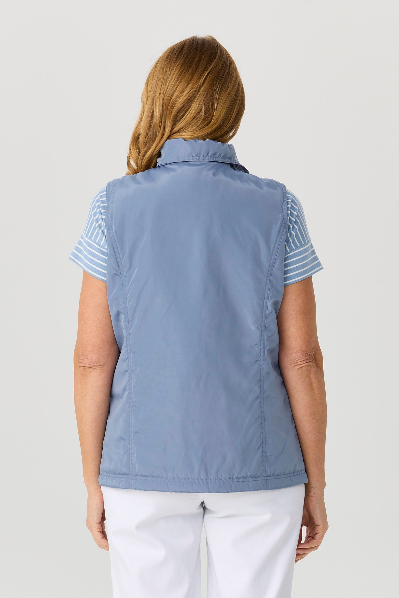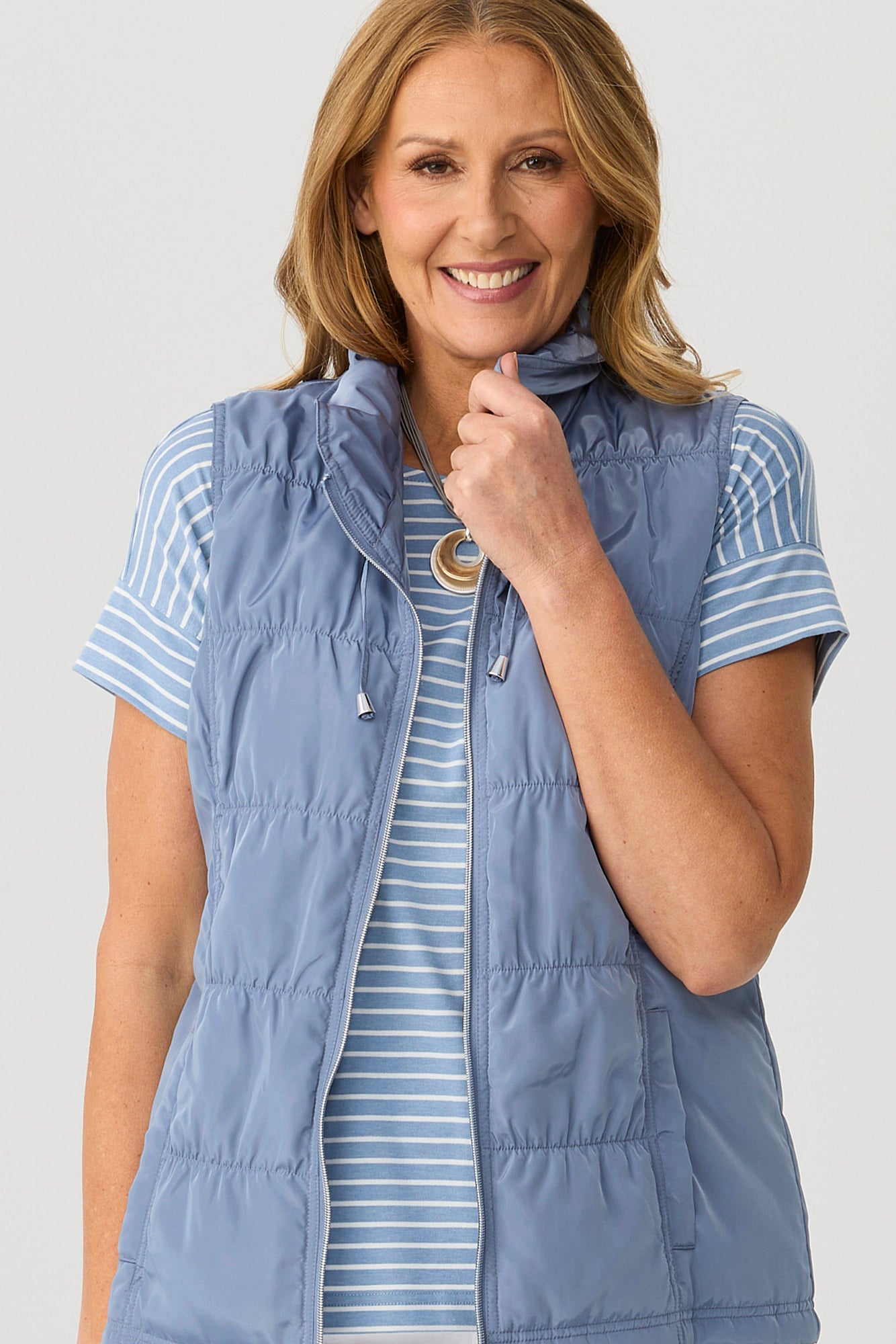 Perfect for lightweight layering on those cooler days, our Lakeshore Zip Up Vest in Bermuda features stylish ruched detailing, a drawstring at collar, and fashionable silver coloured hardware.