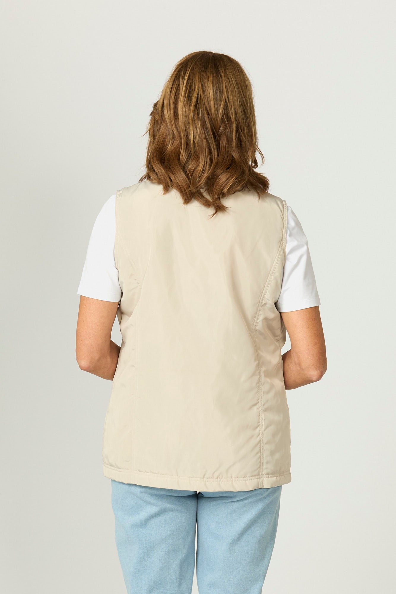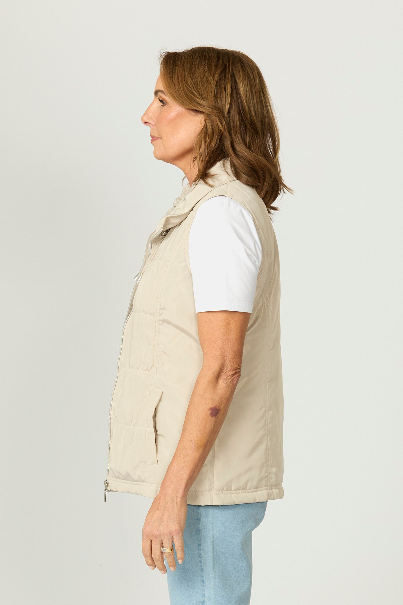 Perfect for lightweight layering on those cooler days, our Lakeshore Zip Up Vest in Natural features stylish ruched detailing, a drawstring at collar, and fashionable silver coloured hardware.