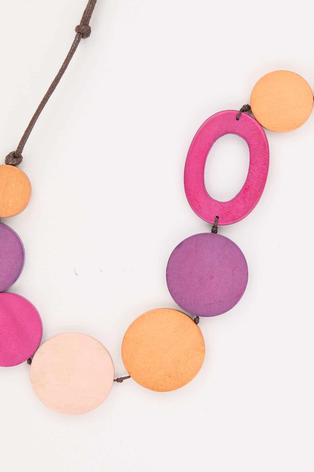 Add a pop of colour and texture to your outfit with the Laurel Wooden Necklace. Featuring a playful mix of bold circular and oval wooden beads, this necklace combines shades of pink, purple, peach, and orange for a vibrant, statement-making look.