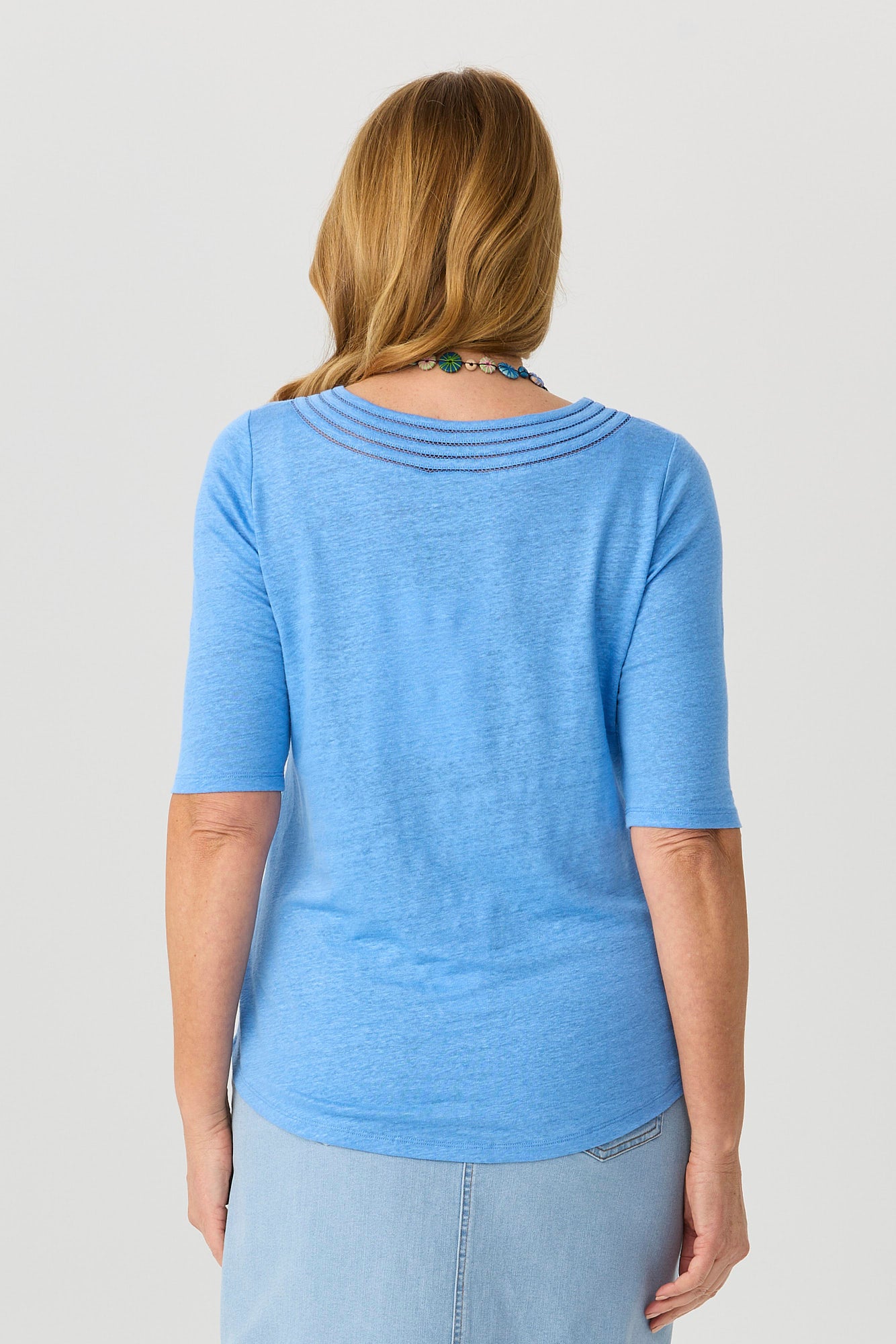 Enhance your wardrobe with the Lia Luxton Bind Elbow Sleeve Top in Ultra Marine. This 3/4 sleeve tee features a round neckline with unique cut-out panels and stitch detailing, adding a modern twist. The curved hem ensures a flattering fit, making it a versatile and stylish addition to any collection.
