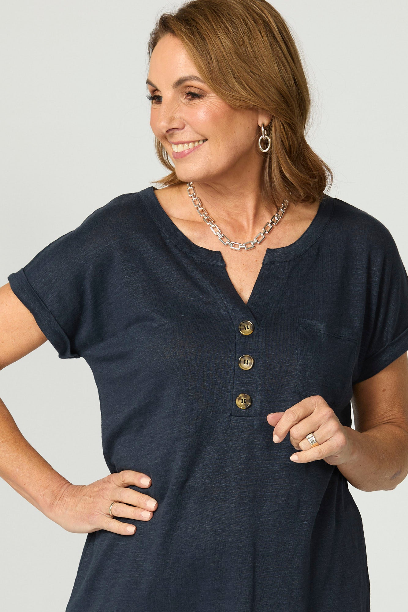 Elevate your everyday essentials with the Lia Luxton V-Neck Button Tee in Navy. Crafted from a luxe linen blend, this relaxed tee features a soft round neckline with a V-insert and buttoned half placket. A front patch pocket and cuffed drop shoulder sleeves add casual refinement to this versatile piece.