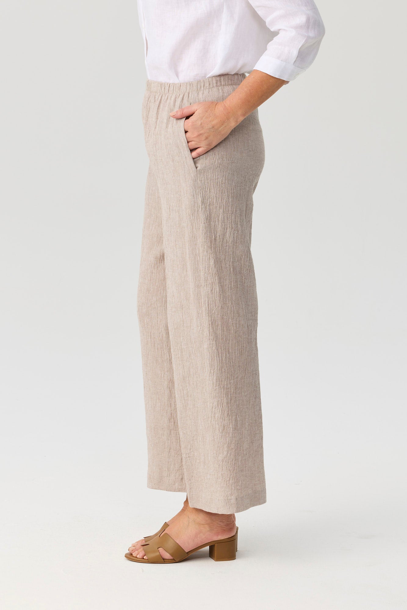 Step into comfort and sophistication with the Lumina Wide Leg Pull On Pant in Oatmeal. Made in Australia, these pants feature a lightweight textured fabric and an easy pull-on design. The wide-leg silhouette offers flow and ease, while the elasticated waist and inner side pockets ensure all-day wearability.