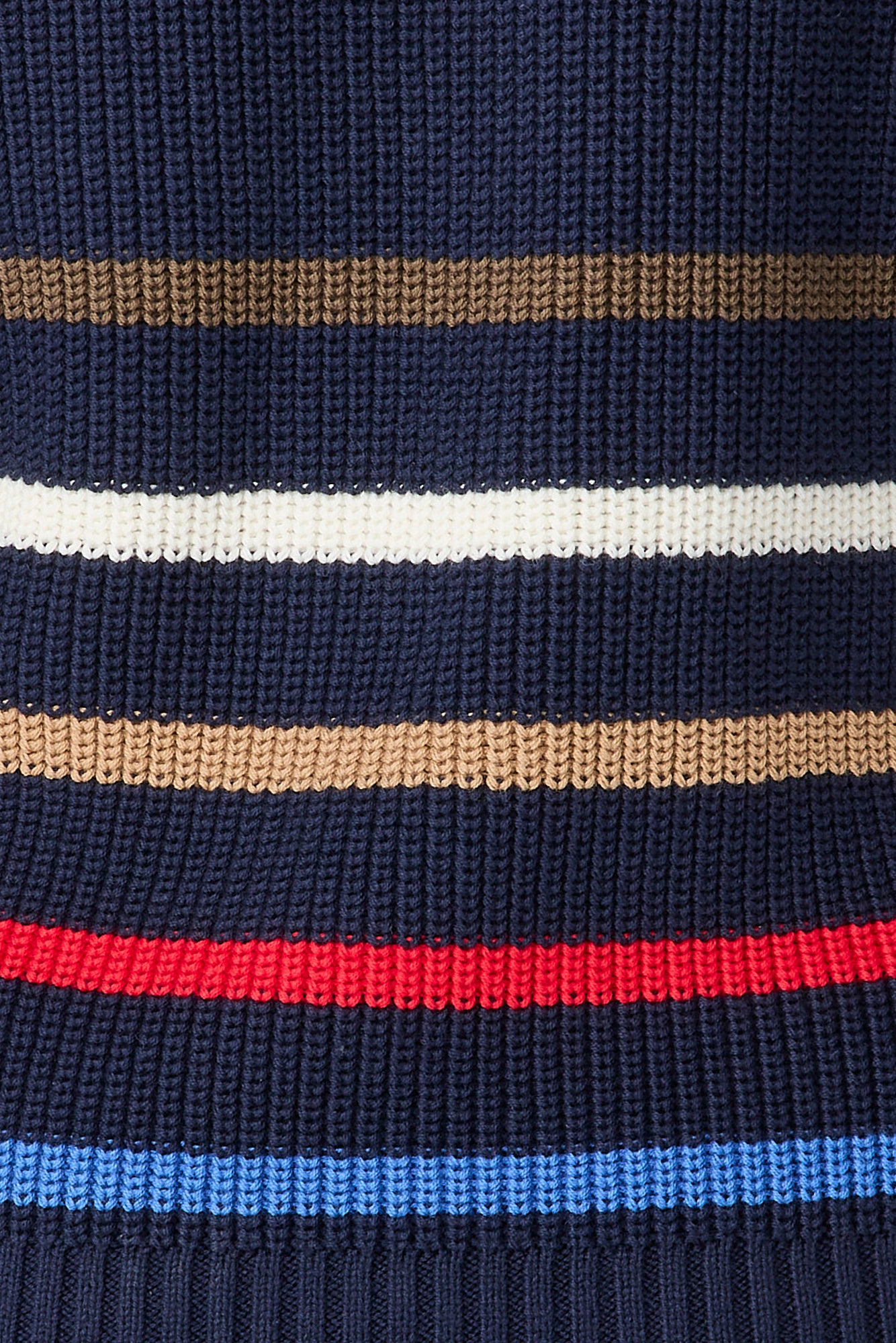 Elevate your casual knitwear with the Matilde 1/4 Zip Sweater in Navy Multi. Crafted from 100% cotton knit this piece blends comfort with statement style through its vibrant multi colour stripe placement across the body and sleeves. The ribbed stitch detailing and sporty zip neckline create a refined yet relaxed look perfect for effortless everyday layering.
