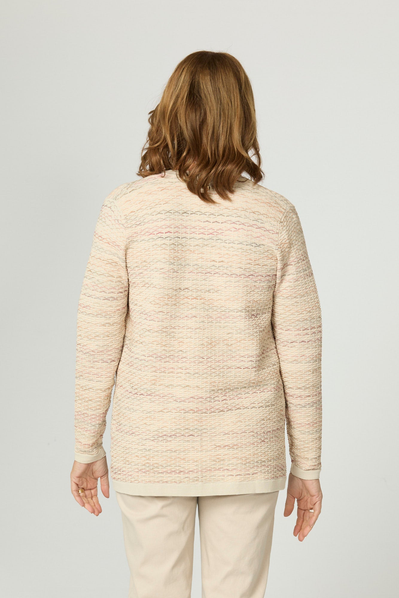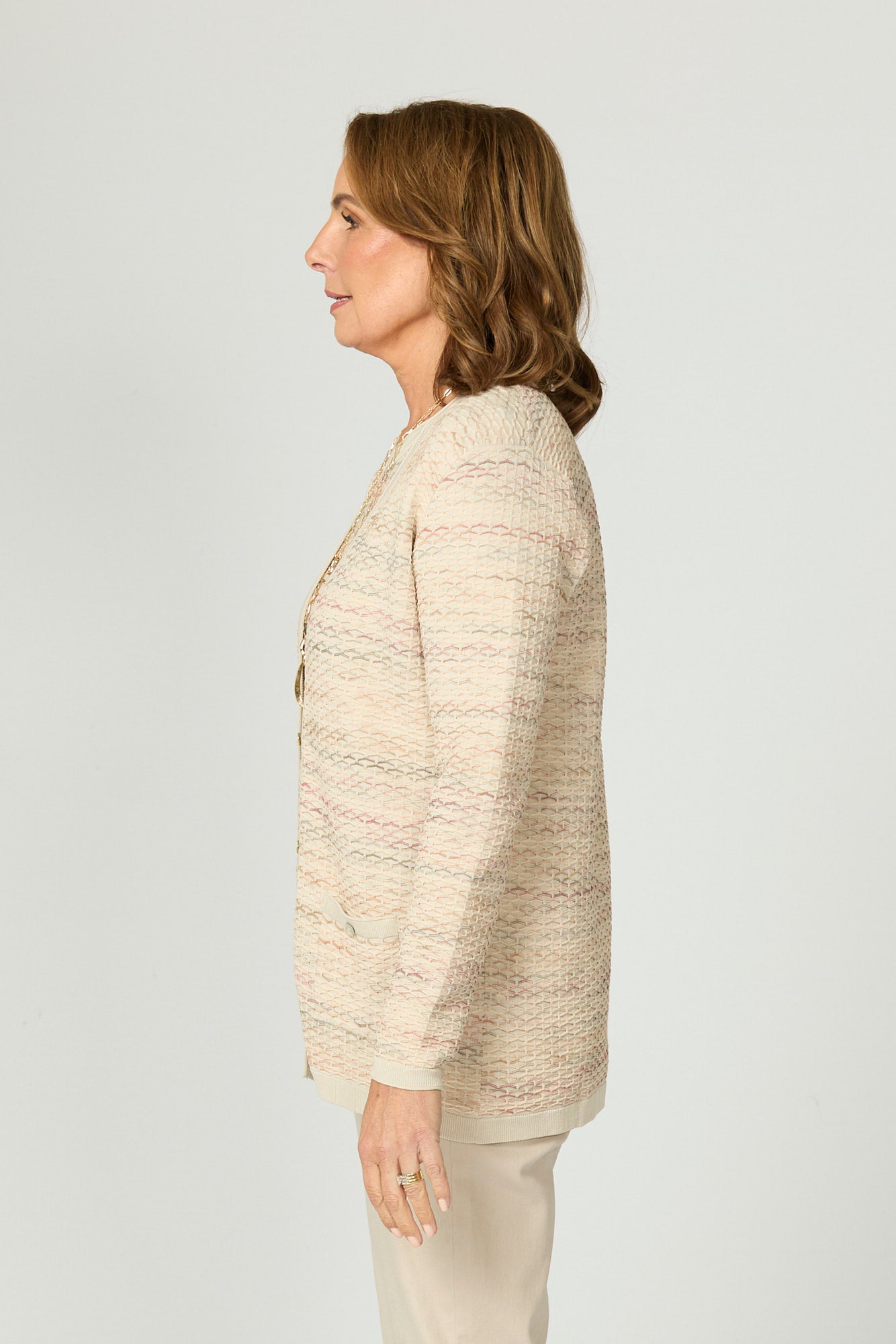 Wrap yourself in understated elegance with the Mavis Textured Button Cardi in Natural Multi. Crafted from luxe space dye yarn, this tonal textured knit offers a soft, elevated feel. Featuring a V-neckline, shell buttons, and a front patch pocket with button closure, it’s detailed with rib trims and subtle jersey roll accents for a refined finish.