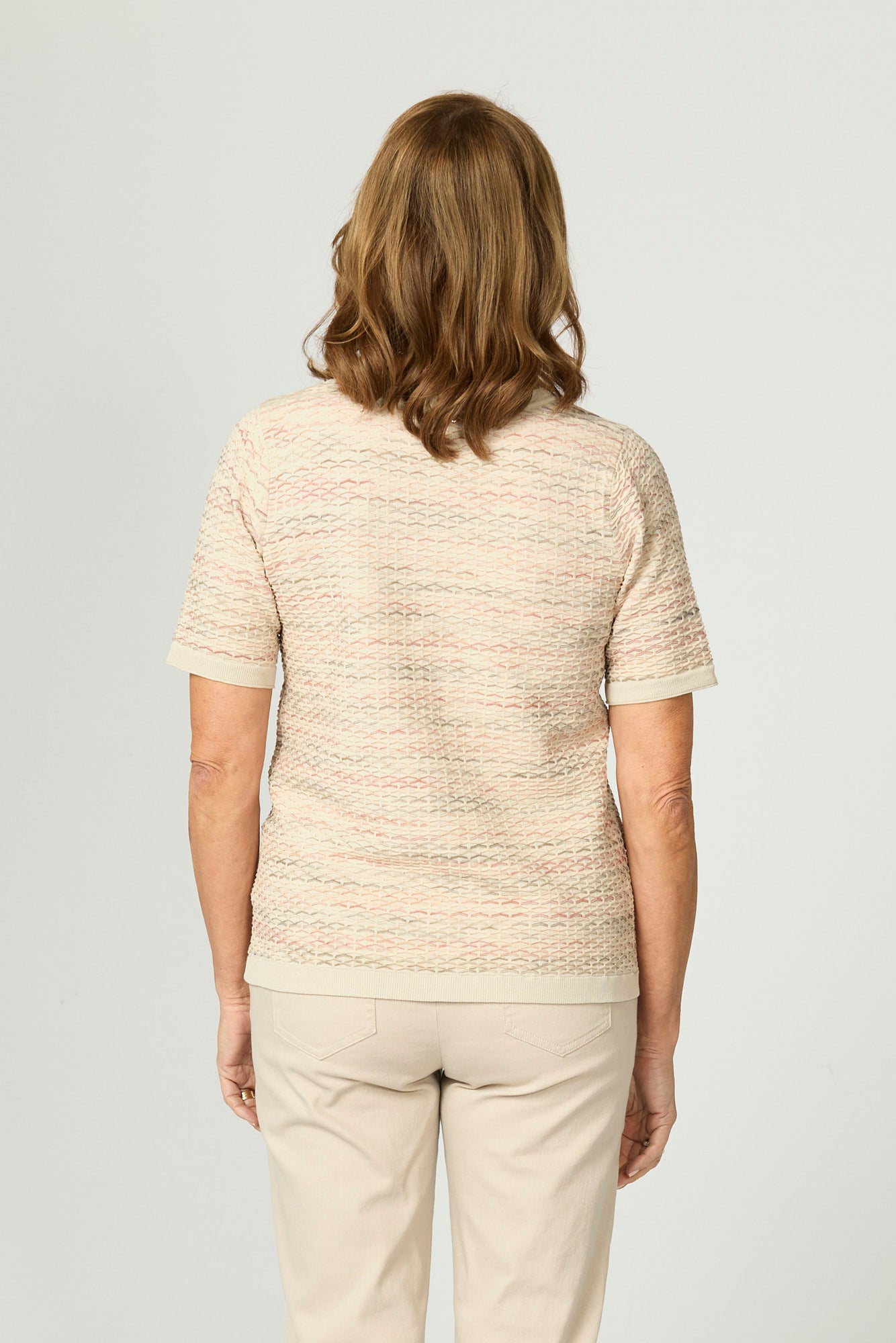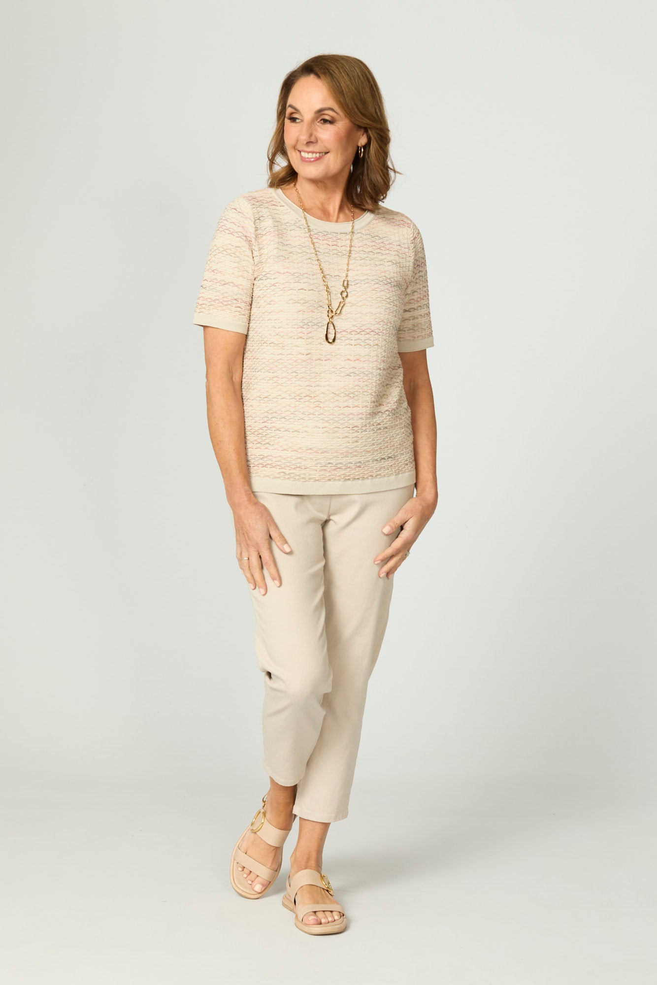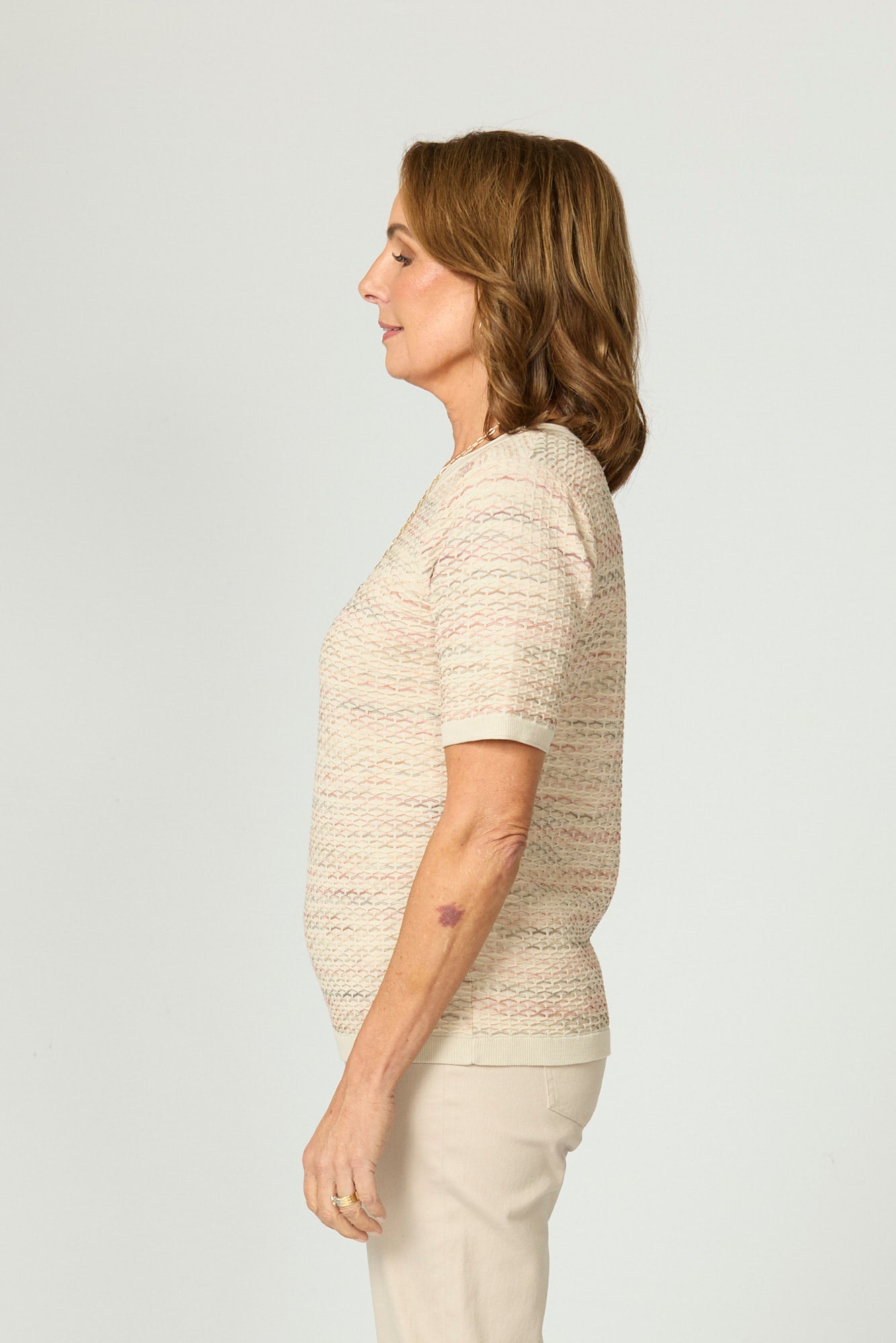 Keep it effortlessly refined with the Mavis Textured Short Sleeve Knit in Natural Multi. Crafted from a luxe cotton blend with space dye yarn, this tonally textured knit delivers softness and subtle dimension. Finished with rib trims and delicate jersey roll detailing, it’s a polished piece for everyday wear.