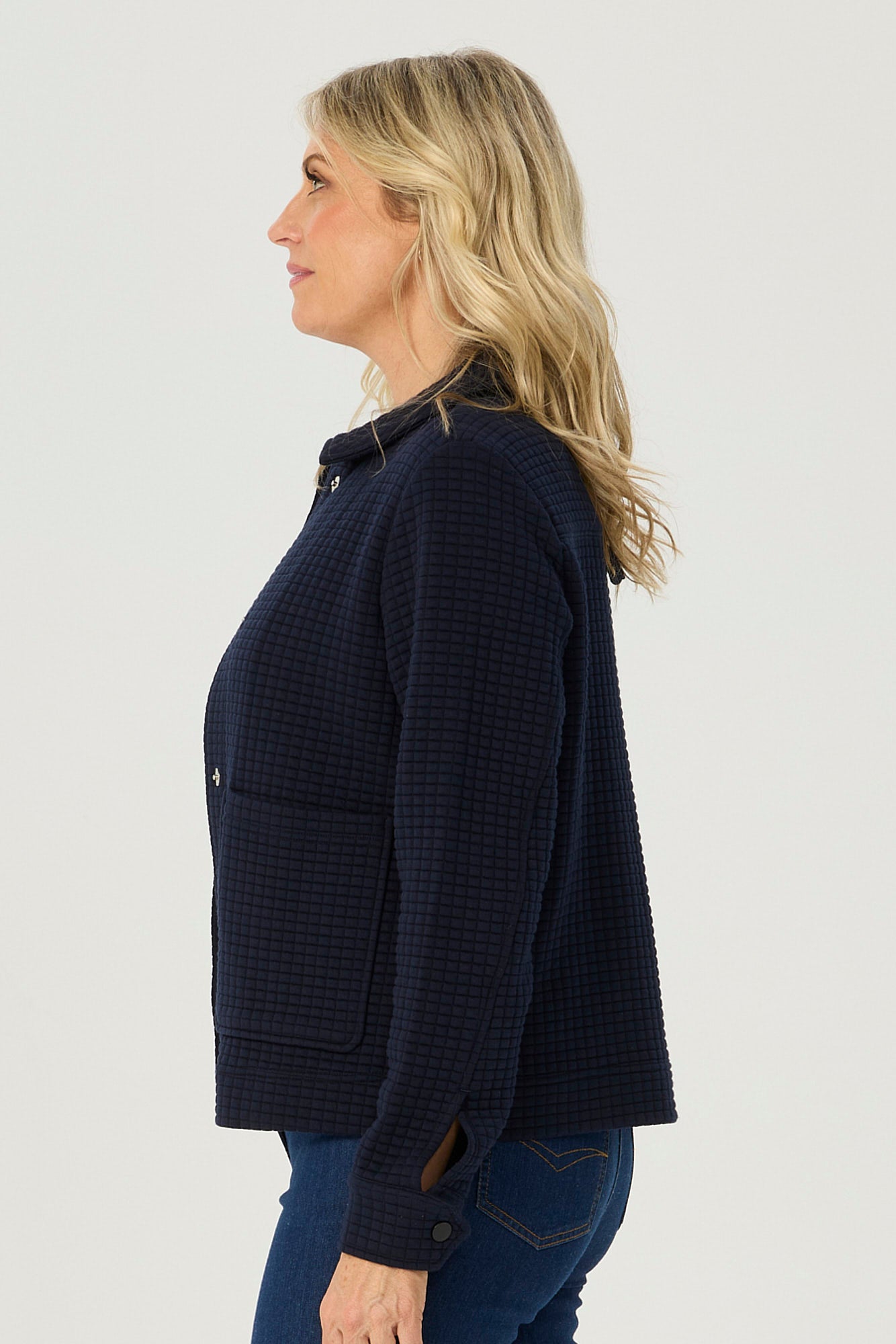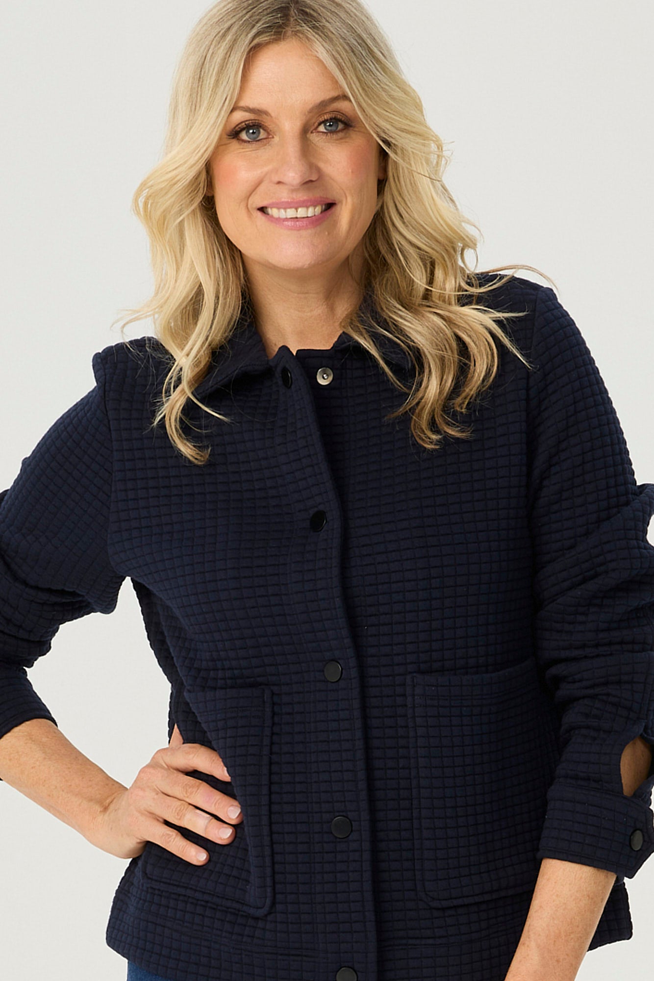 Refresh your outerwear with the timeless appeal of the Nevis Textured Collared Jacket in Navy. Crafted from a soft double knit fabric, this jacket blends structure with comfort. Detailed with tonal snap buttons, patch pockets, and a feature back yoke with hanger loop, it’s a modern take on a classic collared design—perfect for layering through the seasons.