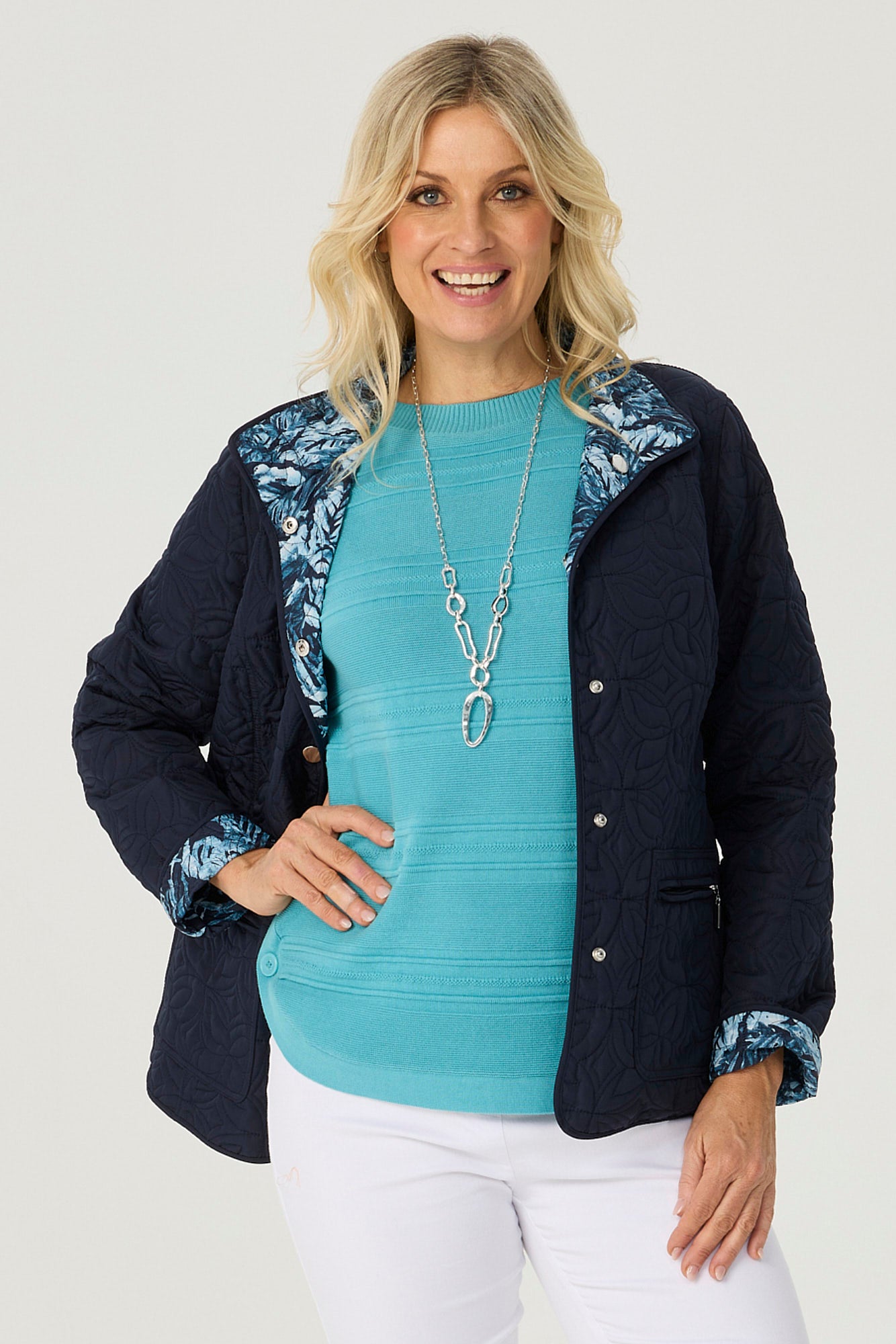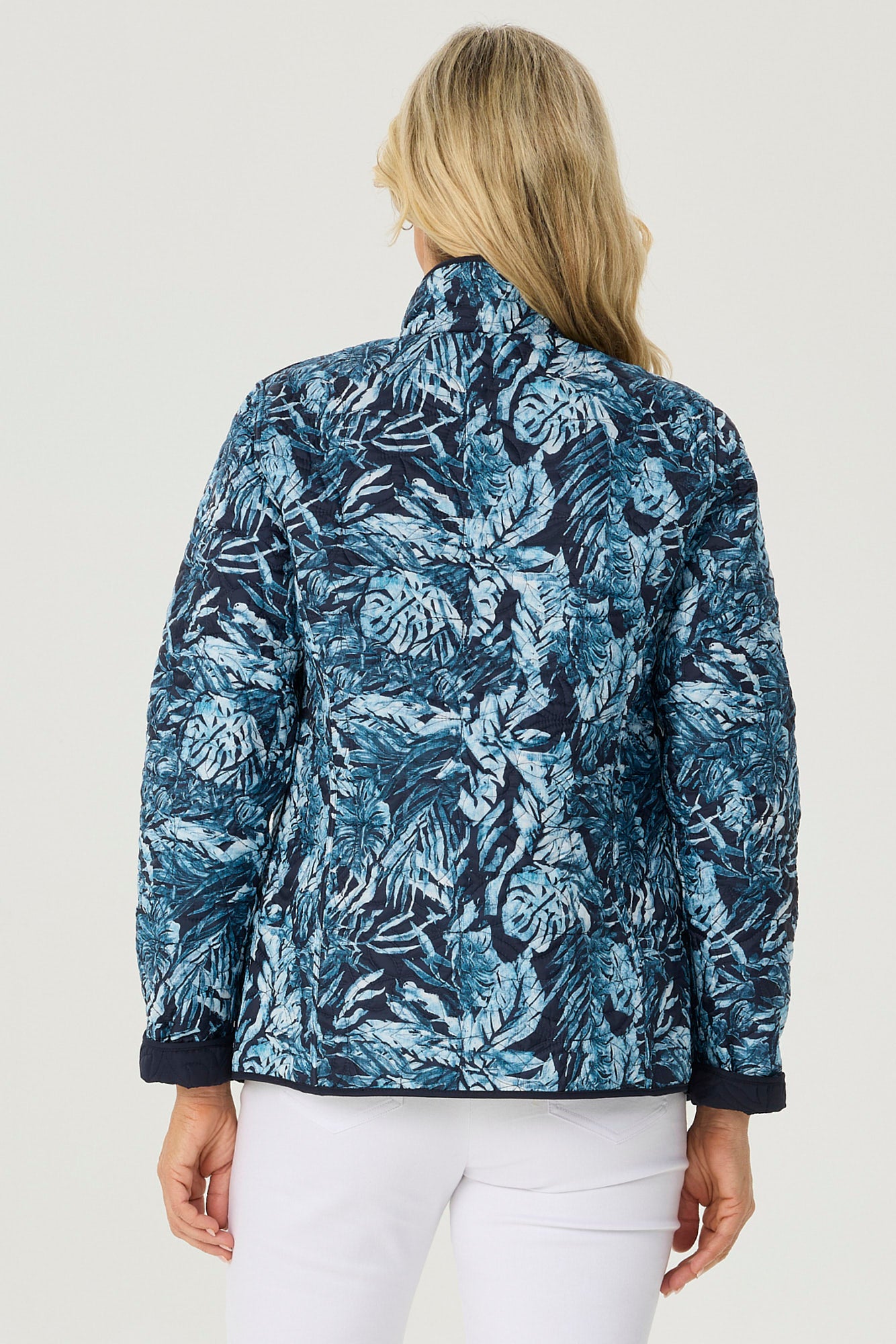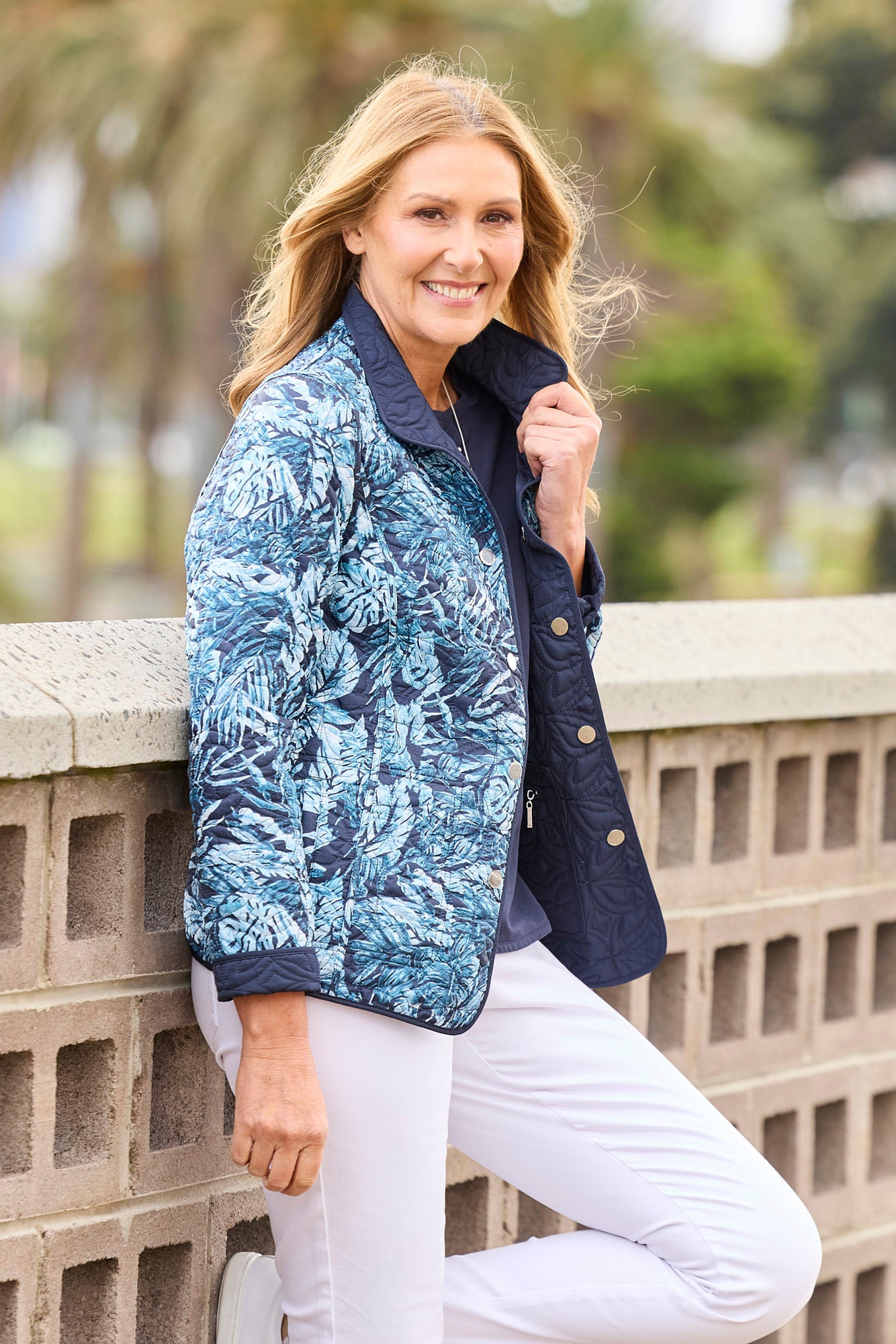 Embrace versatility and effortless style with the Palm Springs Reversible Jacket in Navy Mix. Designed for dynamic dressing, this jacket offers two looks in one—featuring a bold tonal botanical print on one side and a sleek navy front on the other. Finished with silver hardware and a modern stand collar, it’s a chic outer layer for any occasion.