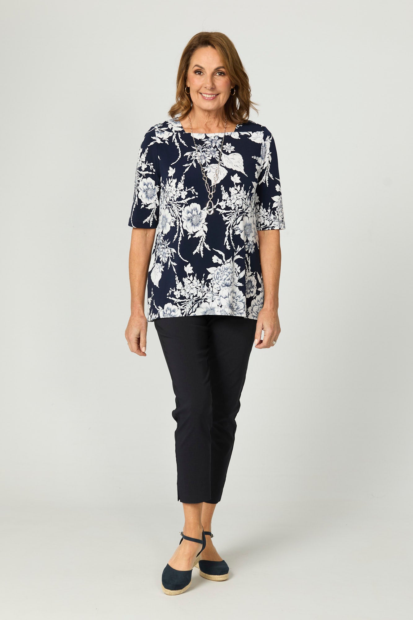 Step into timeless elegance with the Panache Elbow Sleeve Square Neck Top in Navy/White. Proudly made in Australia, this top showcases a romantic monochrome floral print enriched with raised puff detailing. The square neckline adds a touch of sophistication, while elbow-length sleeves and side hem splits ensure comfort and grace in every wear.