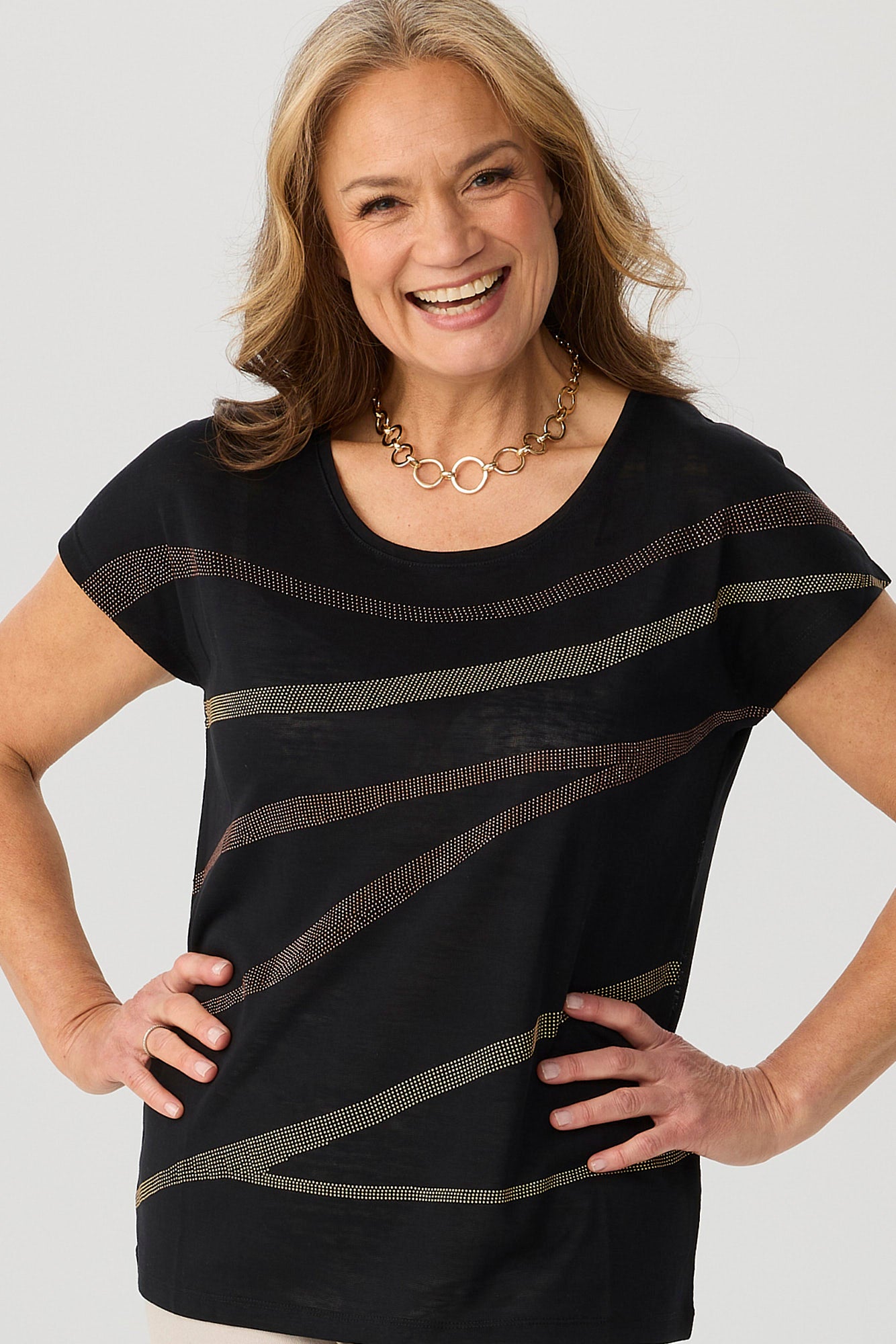 Shimmer with understated elegance in the Party Waves Short Sleeve Top in Black. Designed with a relaxed drop shoulder silhouette, this tee features fine metallic stripe detailing that catches the light with every move. The soft round neckline with self-bind finish completes this effortlessly stylish piece—perfect for elevating your casual ensemble with a hint of glamour.