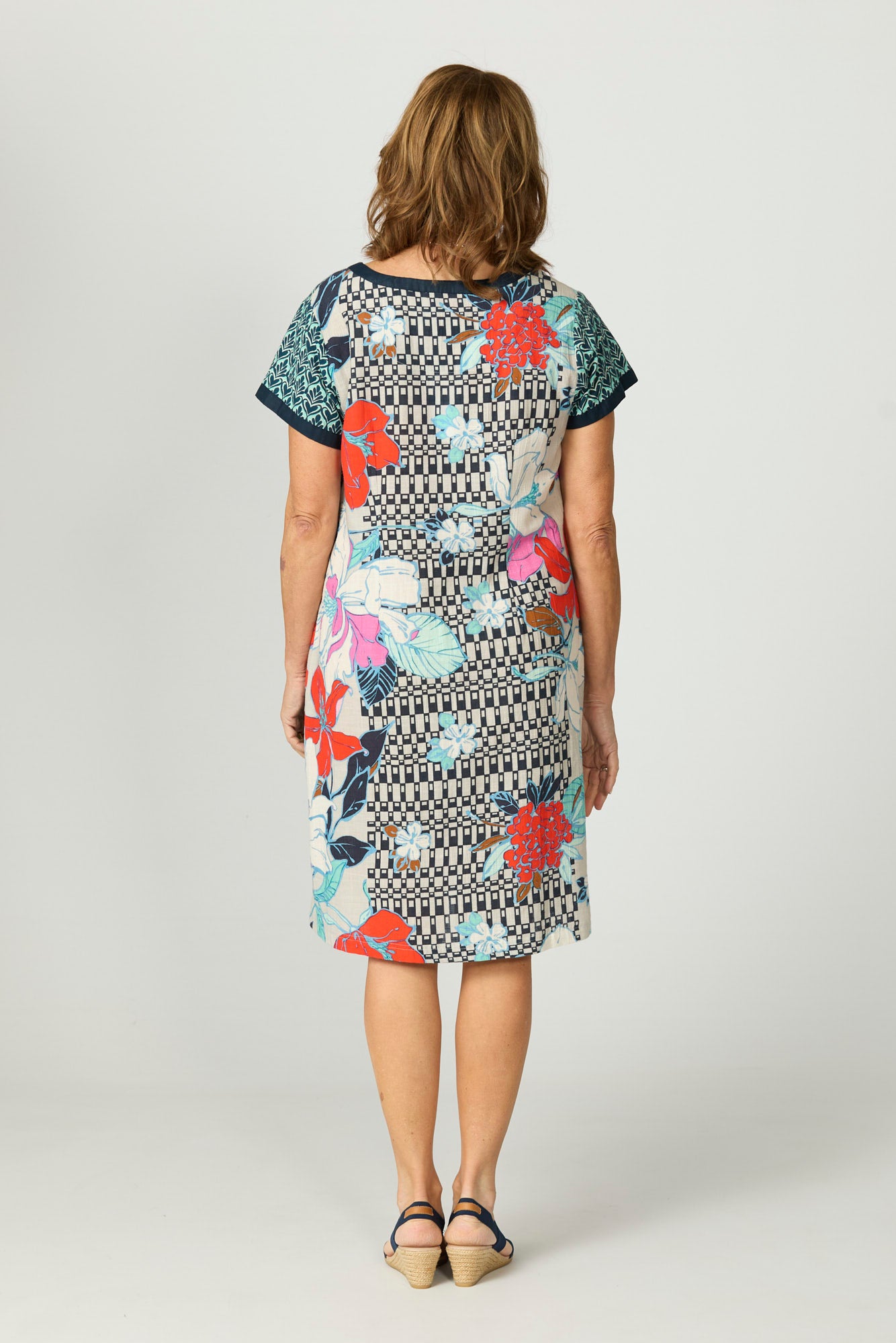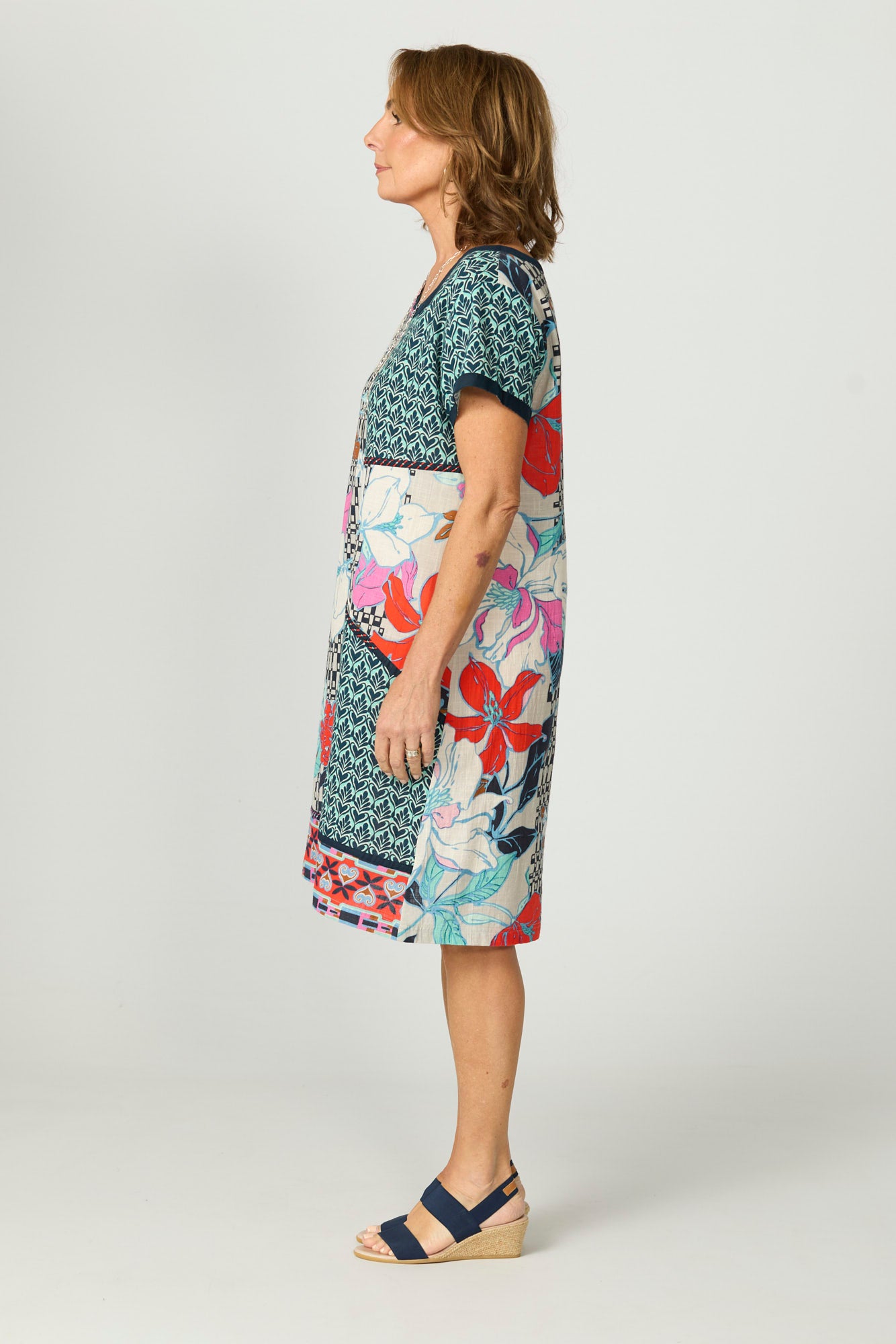 Add a touch of artistic flair to your wardrobe with the Patch Pocket Shift Dress in Oriental Floral. Crafted from 100% cotton, this colourful printed dress showcases an oriental-inspired patchwork design, elevated by embroidered stitch detailing throughout. With its comfortable shift silhouette and striking contrast trims, this dress brings bold beauty and everyday ease together seamlessly.