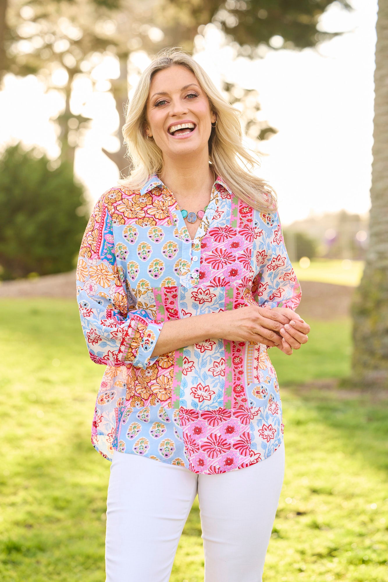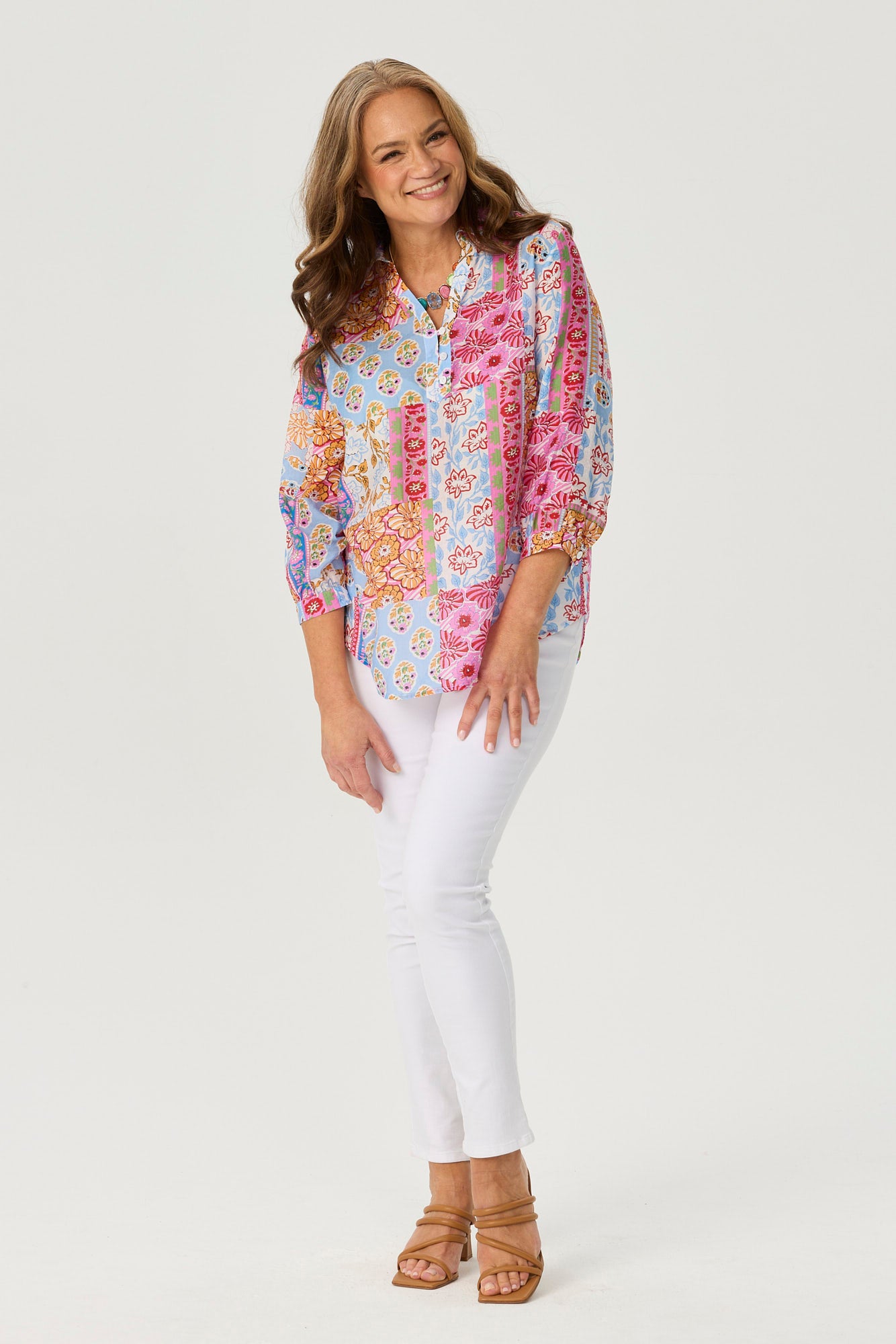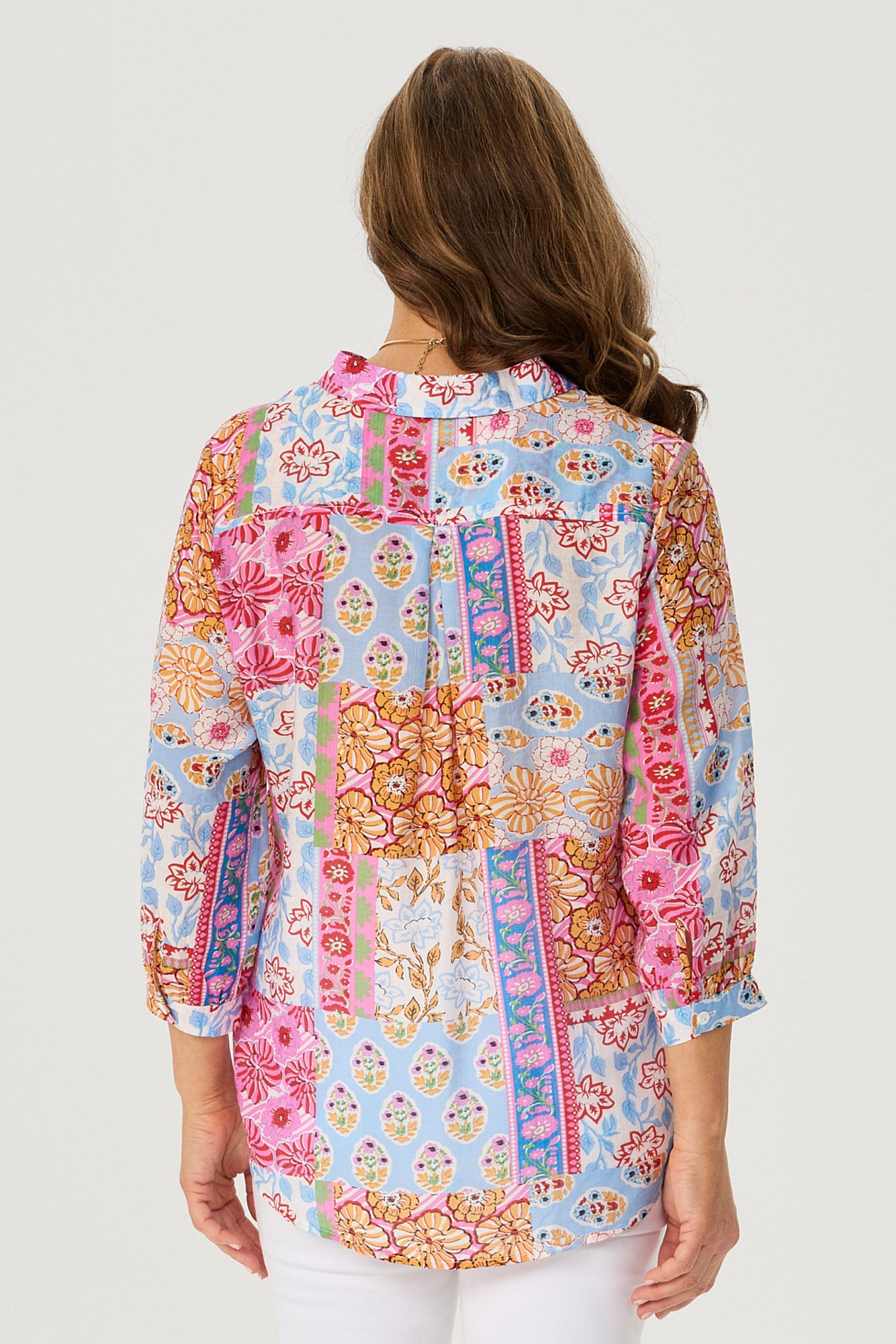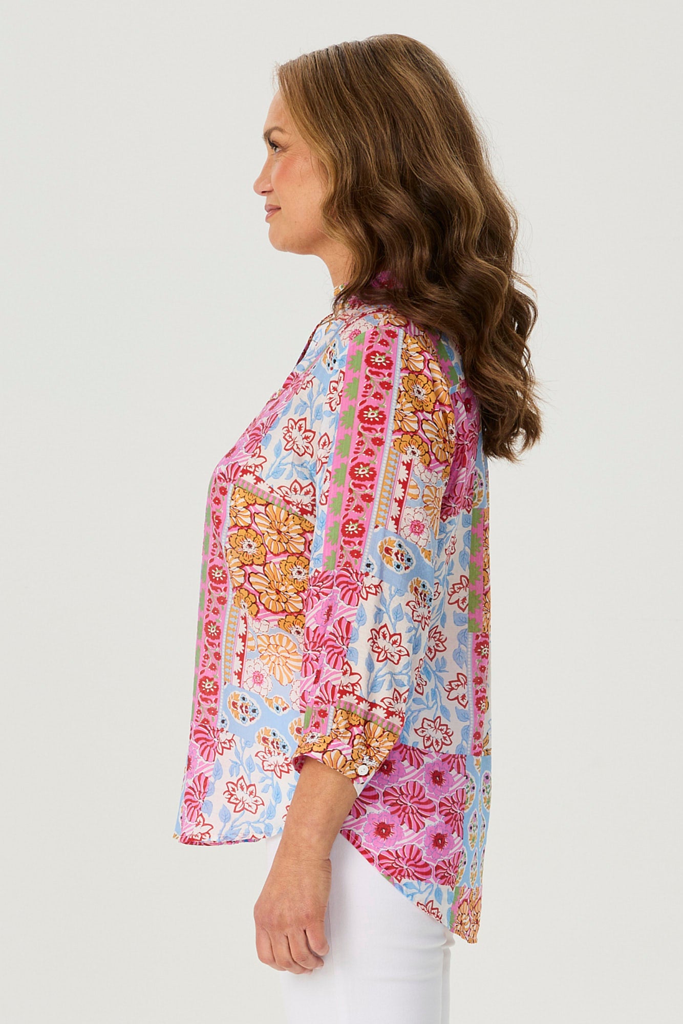 Celebrate vibrant charm with the Patchwork Print 3/4 Sleeve Blouse in Pink Multi. Showcasing an Indian-inspired patchwork design, this blouse bursts with colour and character. The V-insert neckline with button-down detail adds a touch of elegance, while gathered cuffs and a curved hemline complete this breezy, standout look.