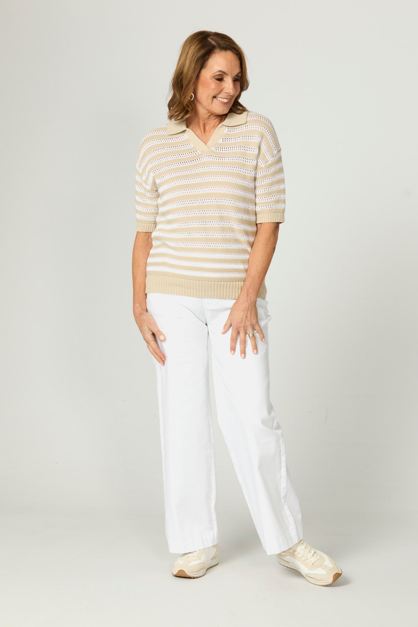 Elevate your casual wardrobe with the Port Fairy Stripe Polo, crafted from soft and breathable 100% cotton knit. This lightweight style features a chic open-weave stripe design in neutral tones, perfect for effortless everyday dressing.