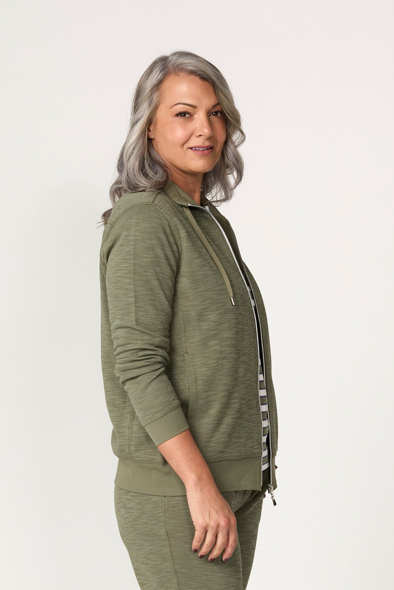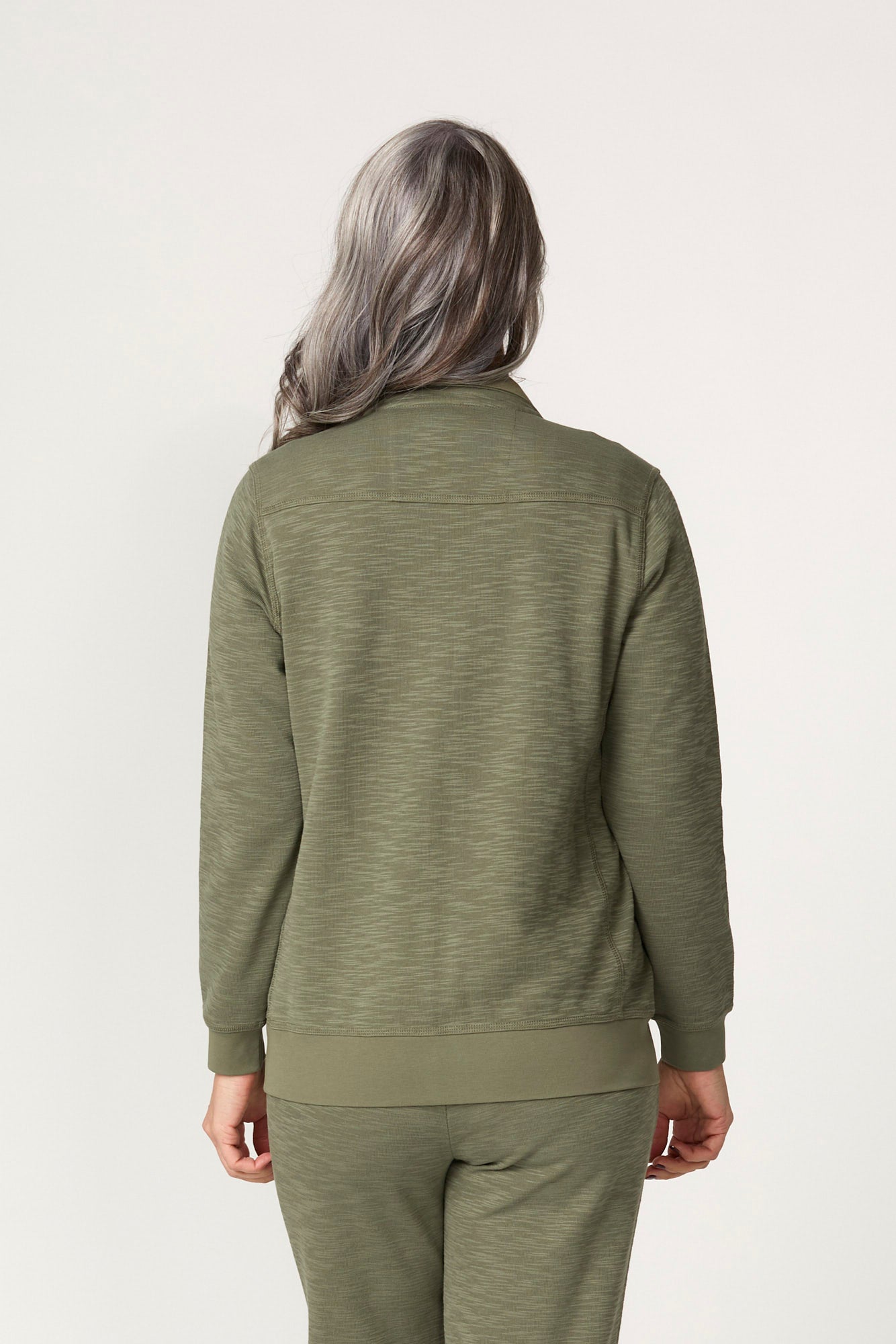 The Retreat Top Stitch Zip Up Jacket in Olive is your go-to layer for r is a jacket that delivers easy movement and comfort for cooler-weather layering. The fabric feels soft, keeping the jacket comfortable against the skin during long wear. Cuffed sleeves add a neat finish and keep the sleeve line in place. A relaxed fit skims the body for comfort and gives you room to move through the day.