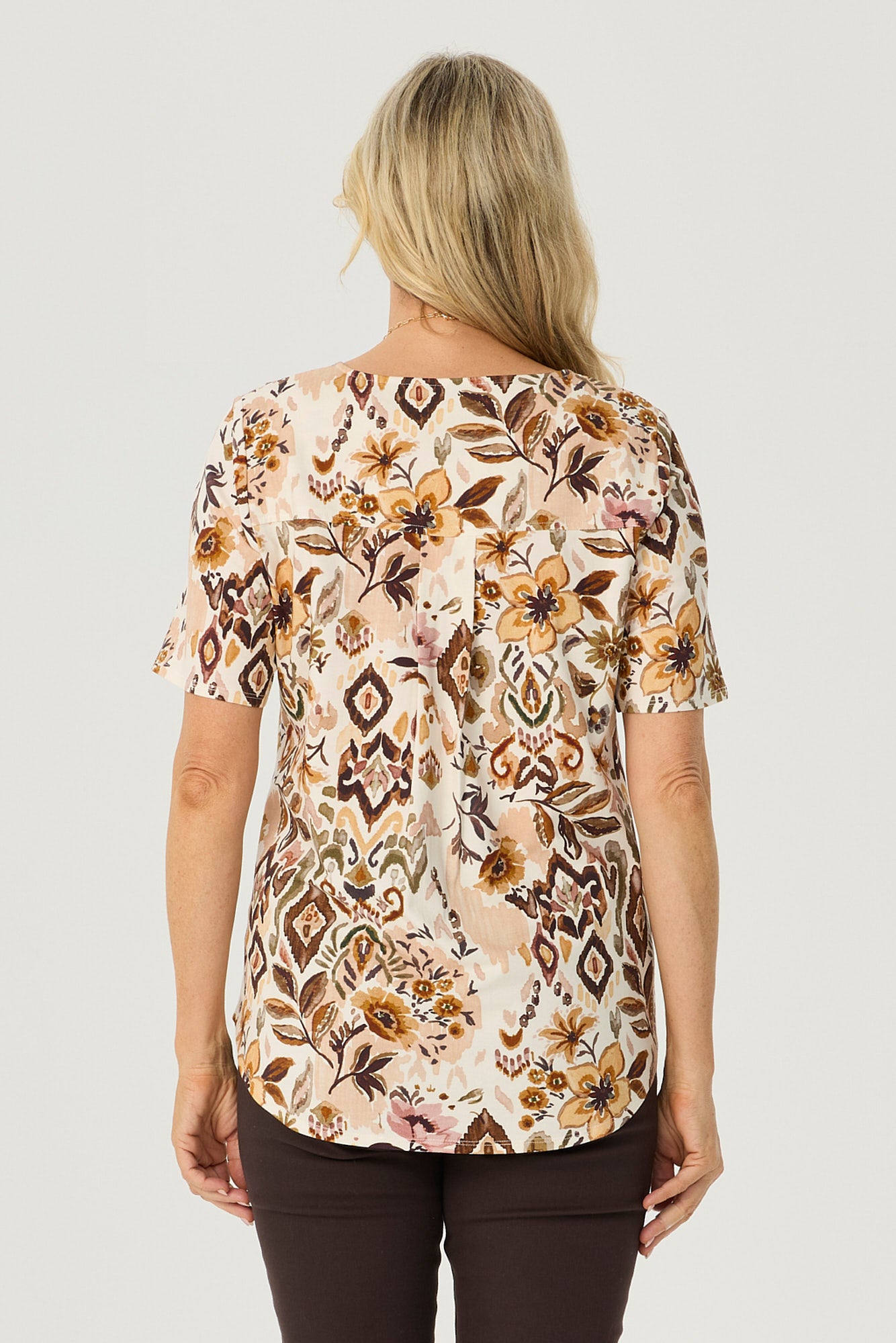 Add a touch of artistic flair to your everyday wardrobe with the Sierra Short Sleeve Pleat Back Tee in Multi. Crafted from a soft, stretch jersey and finished in a tonal ikat-inspired print, this tee offers a flattering fit with a breezy pleat back and curved hem for easy movement.