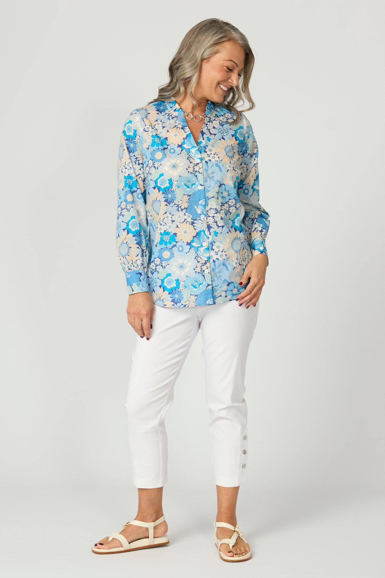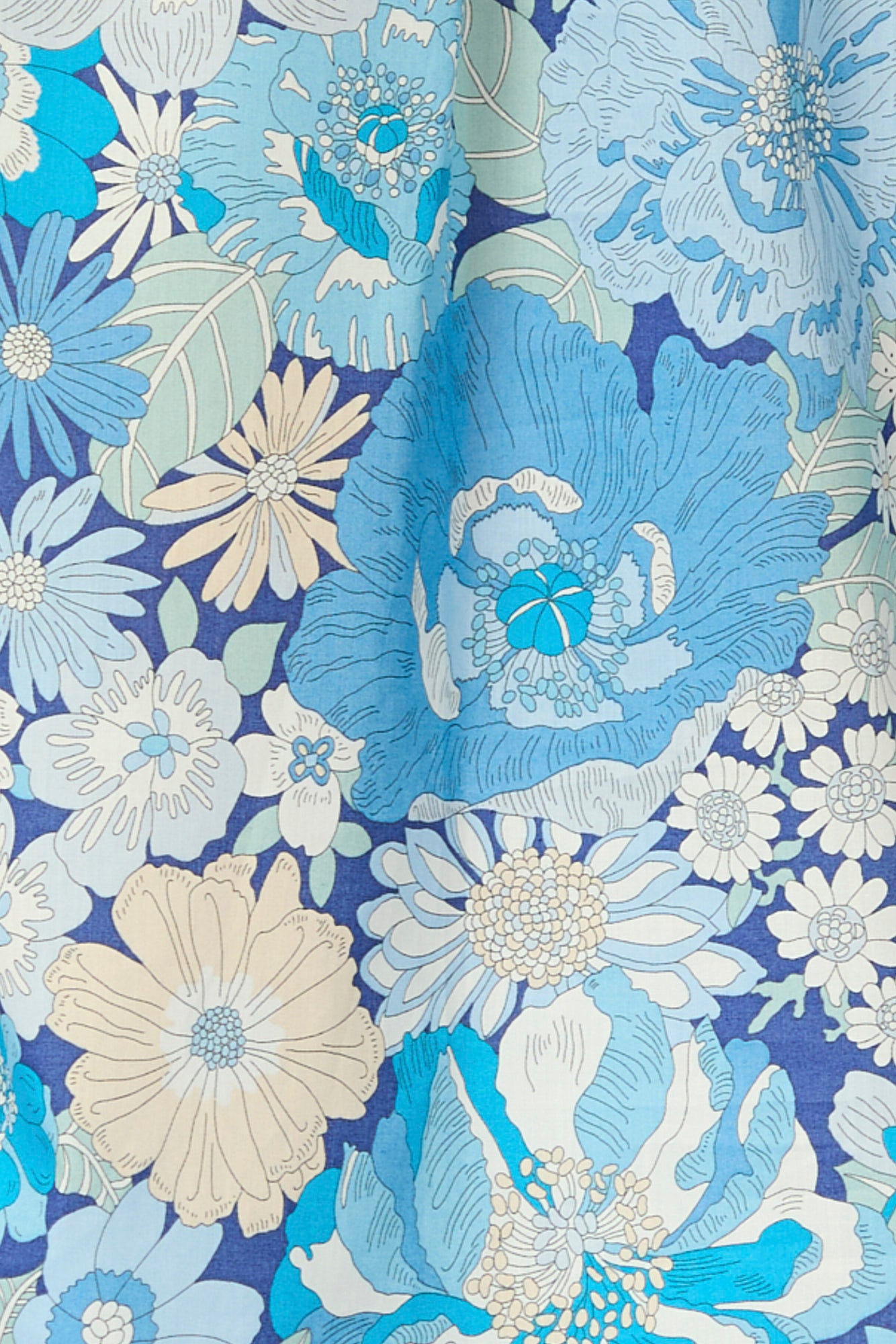 Celebrate vibrant heritage with the Summer in the Sun Liberty Shirt in Blue Mix. Made in Australia and crafted from exclusive Liberty of London 100% cotton, this shirt showcases a retro-inspired floral print in a luxe, lightweight finish. Thoughtful details like a frilled collar edge and gathered sleeve cuffs add a playful yet refined charm.