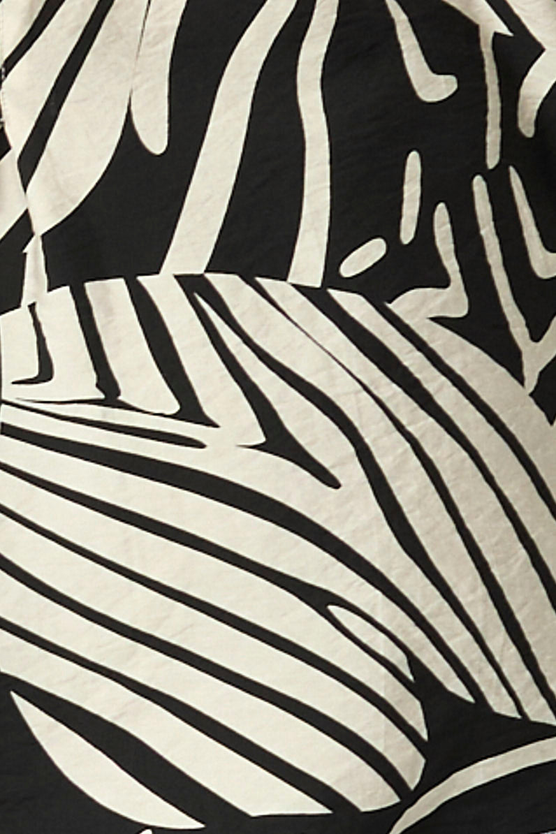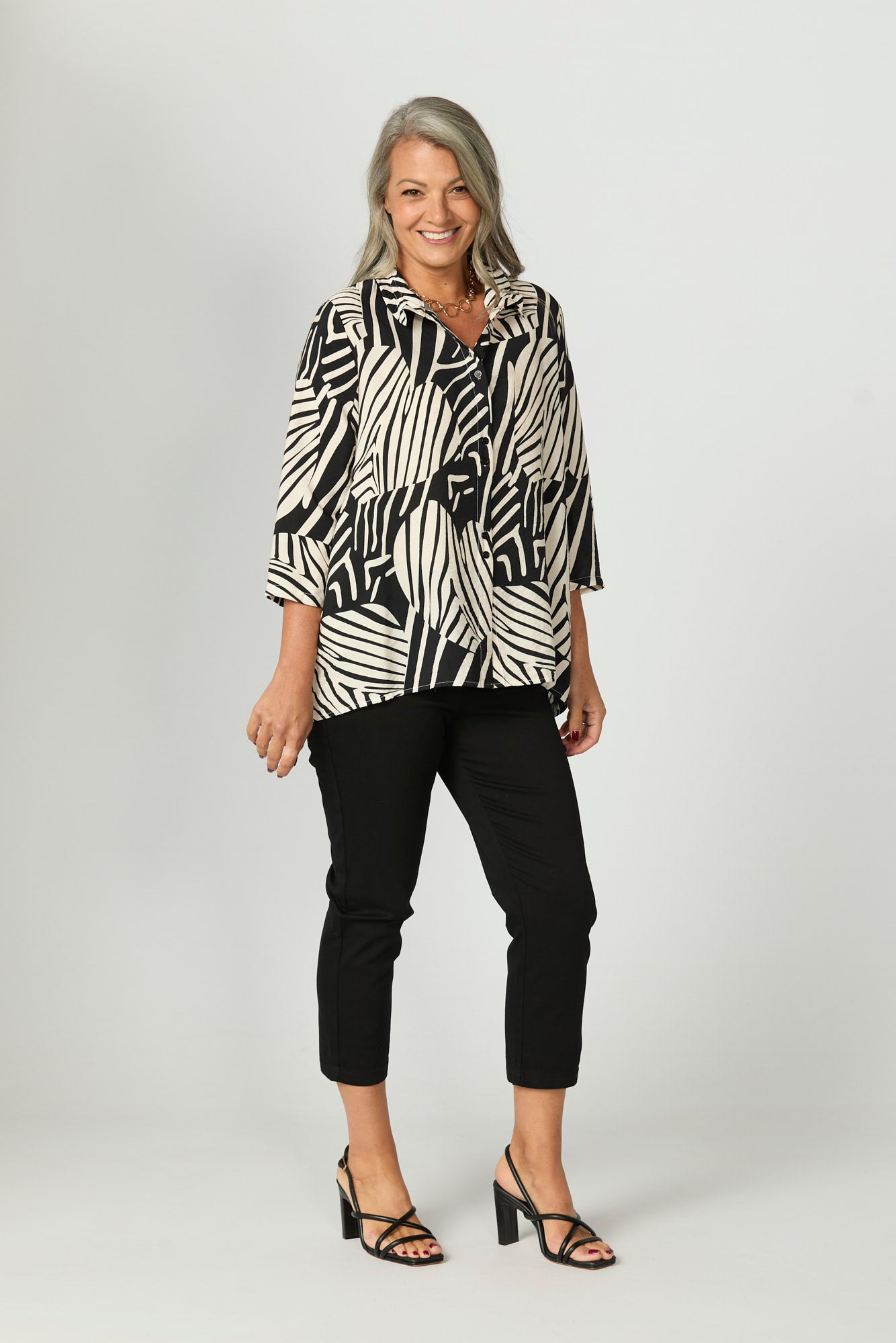 Step into bold sophistication with the Tahara 3/4 Sleeve Zip Back Shirt in Black/Ivory. Showcasing a striking graphic monotone print, this shirt blends statement style with refined details. The adjustable frill collar adds a feminine twist, while the unique zip back closure offers a modern edge—perfect for effortlessly chic dressing.