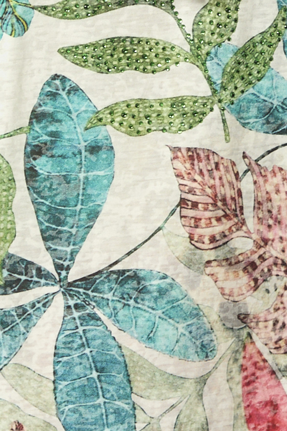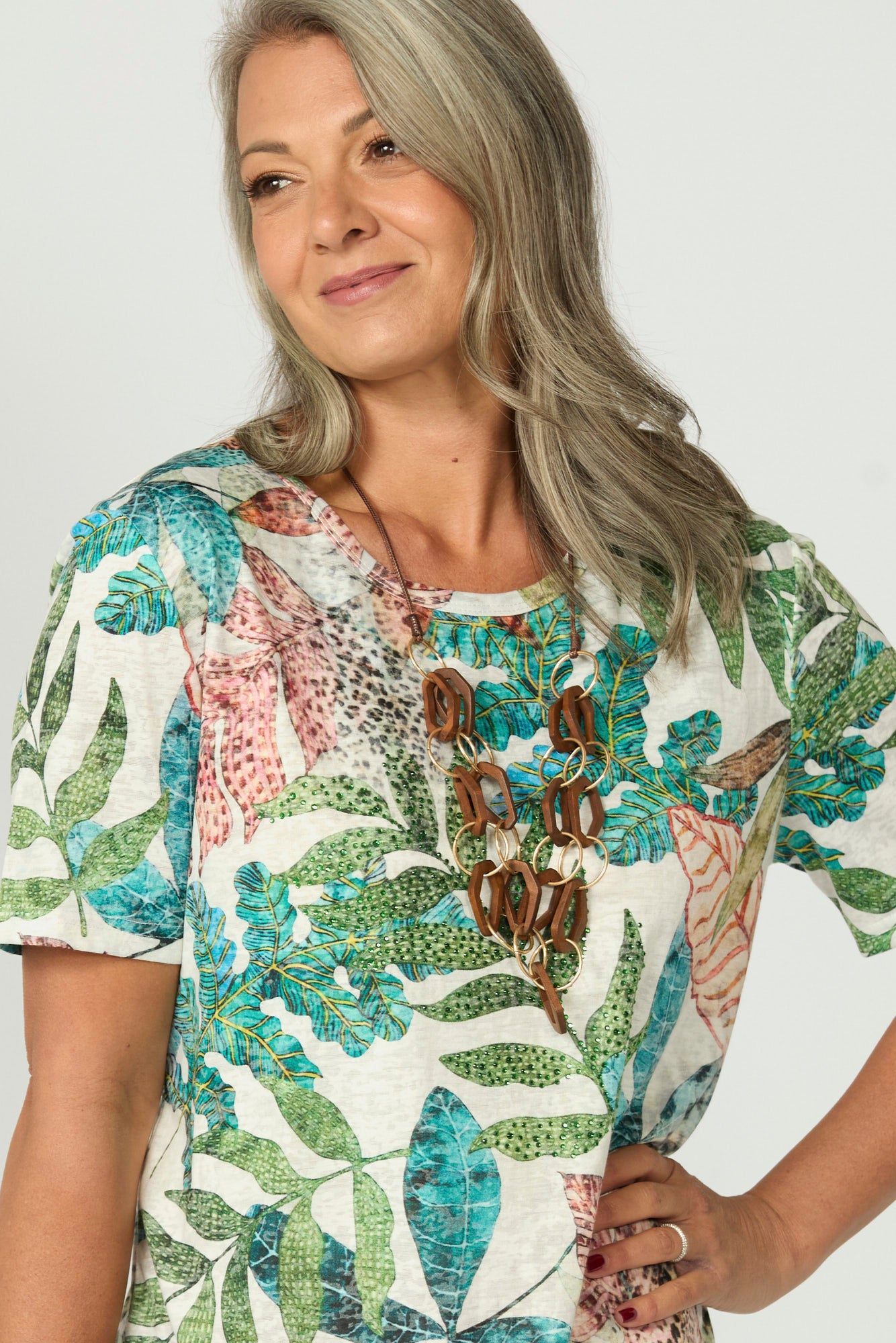 Brighten your wardrobe with the Tropical Mirage Short Sleeve Diamante Tee in Multi. Featuring a bold botanical print and eye-catching diamante detailing, this tee adds sparkle to everyday style. The round neckline with self-bind and classic short sleeves ensure an easy, comfortable fit with a touch of glam.
