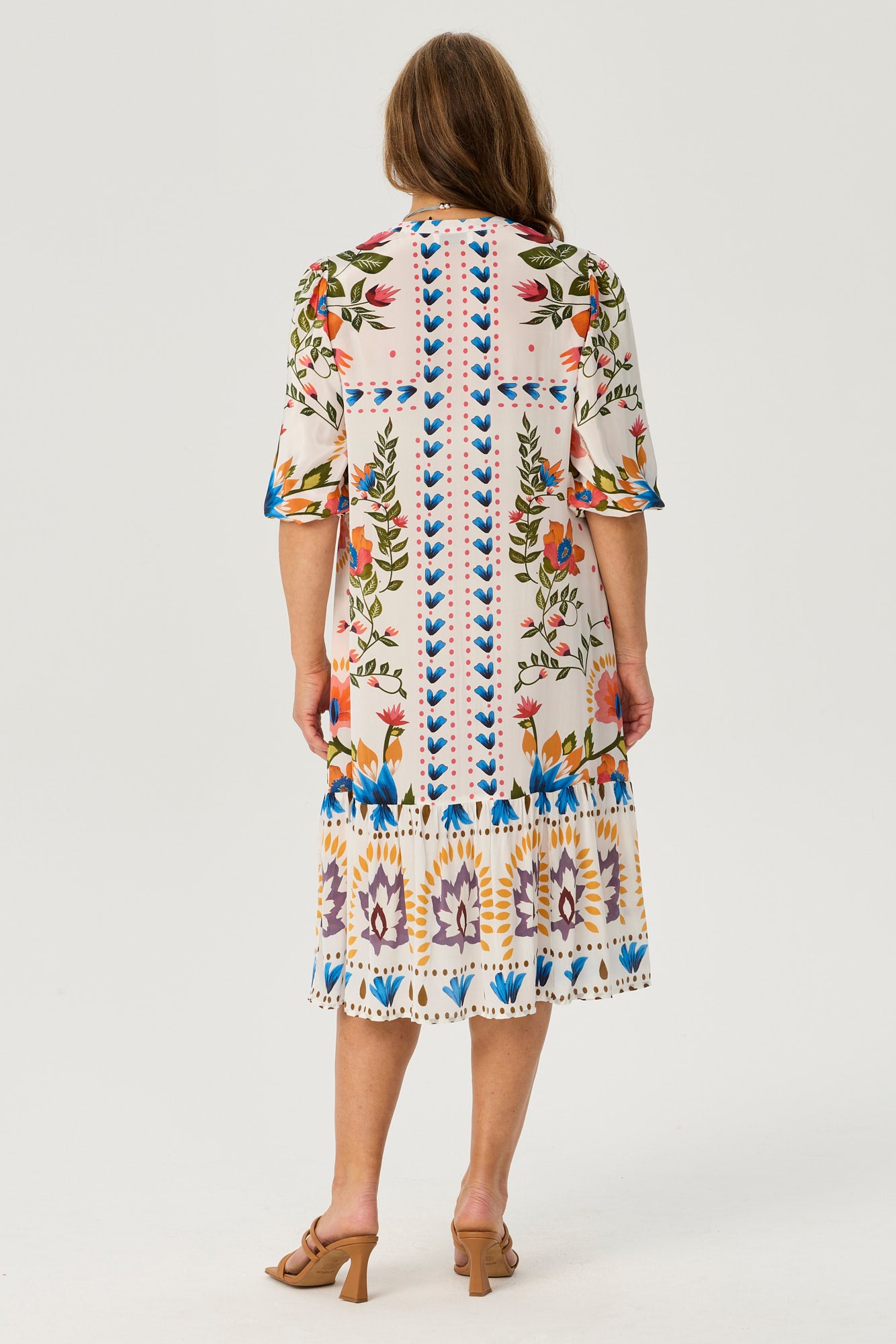 Step into soft femininity with the Tuscany Print Frill Hem Dress in White Multi. Showcasing a vintage-inspired floral print, this breezy midi dress features elegant gathered detailing, a contrast border hem, and a silky-soft feel—perfect for days when comfort and charm go hand in hand.