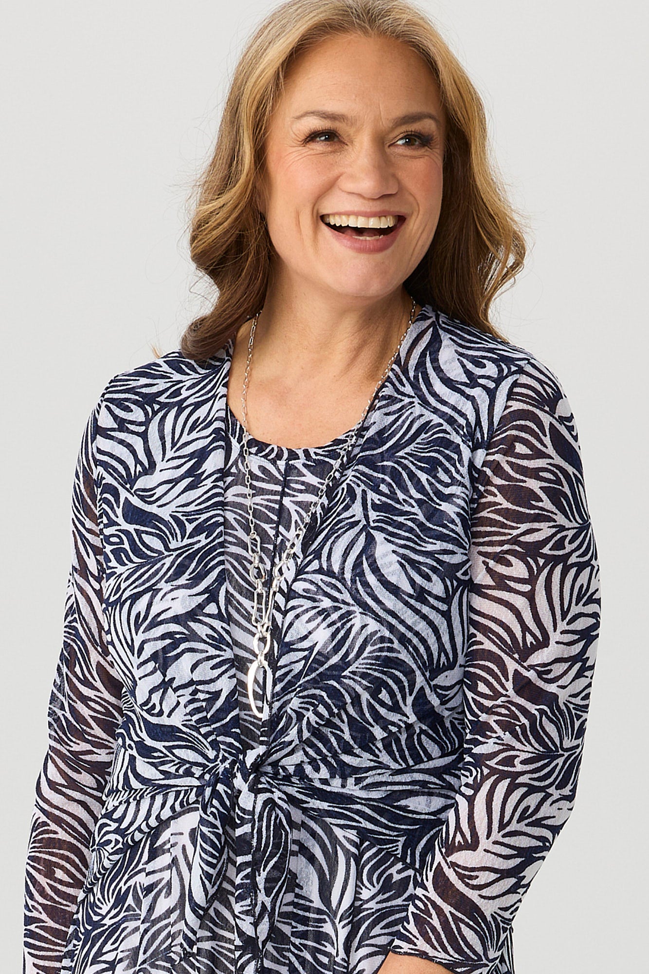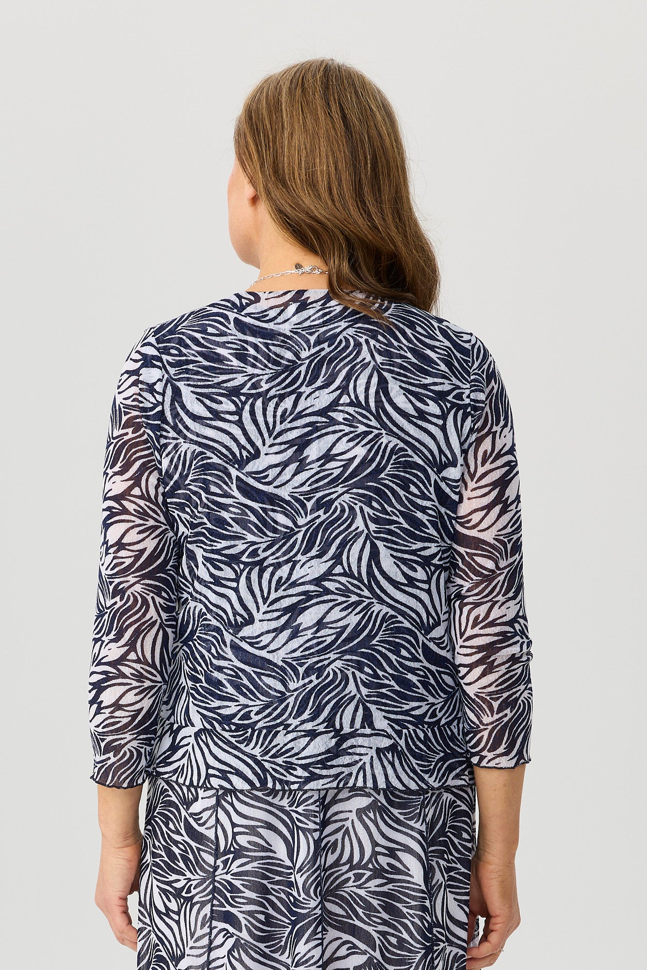 Make a statement in light layering with the Veneta Mesh Crop Print Cardigan in Navy and White. Featuring a striking graphic botanical print, this breezy mesh cardigan adds flair without the weight. Its waterfall front and cropped A-line silhouette create graceful movement, making it the perfect finishing touch for warmer days.