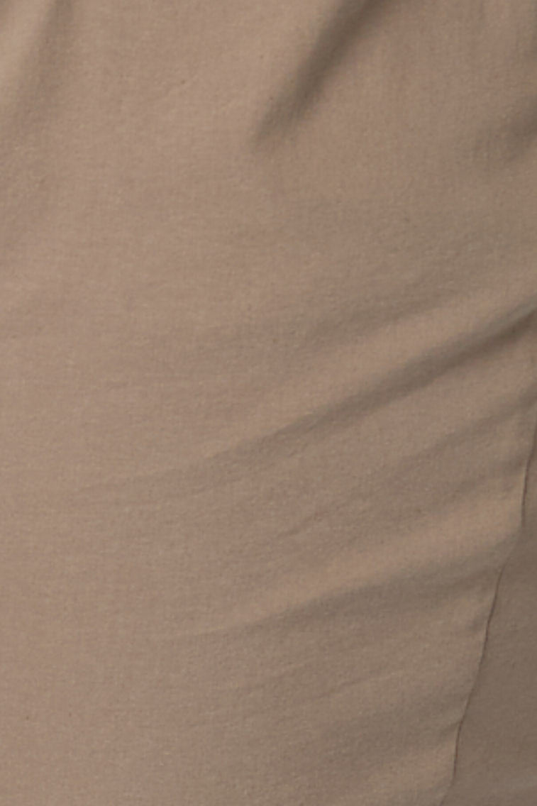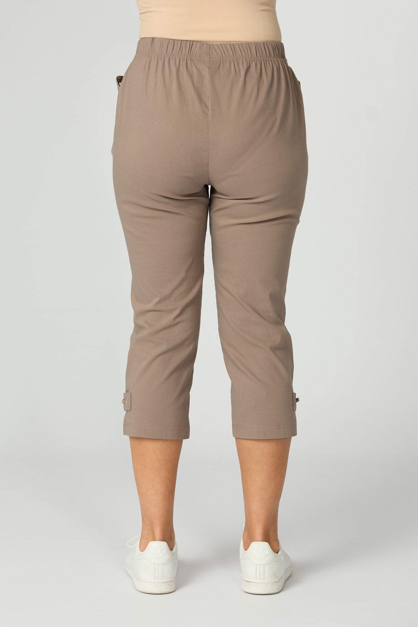 Be stylishly comfortable in these Vibe Stretch Crop Pants in Coffee. The crop leg with side split detail features a small rectangular self-fabric panel with laced through silver coloured eyelets. The eyelets are carried through on the front welt pockets for added detail. Made from a lightweight Cotton-blend fabric, with a comfortable elastic waist band, you’ll be reaching for these pants everyday.