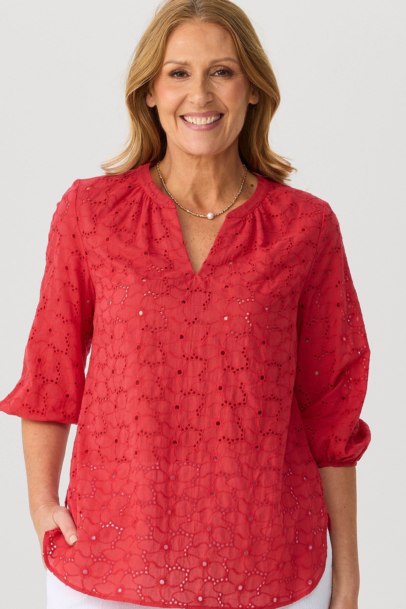 Embrace timeless charm with the Wendy Broderie 3/4 Sleeve Blouse in Red. Made in Australia, this beautifully detailed blouse features delicate broderie anglais floral fabric and a soft curved hem. The round neckline flows into a V-insert with gentle gathering, while the blouson sleeves and elasticated cuffs bring a touch of romantic elegance to your everyday look.